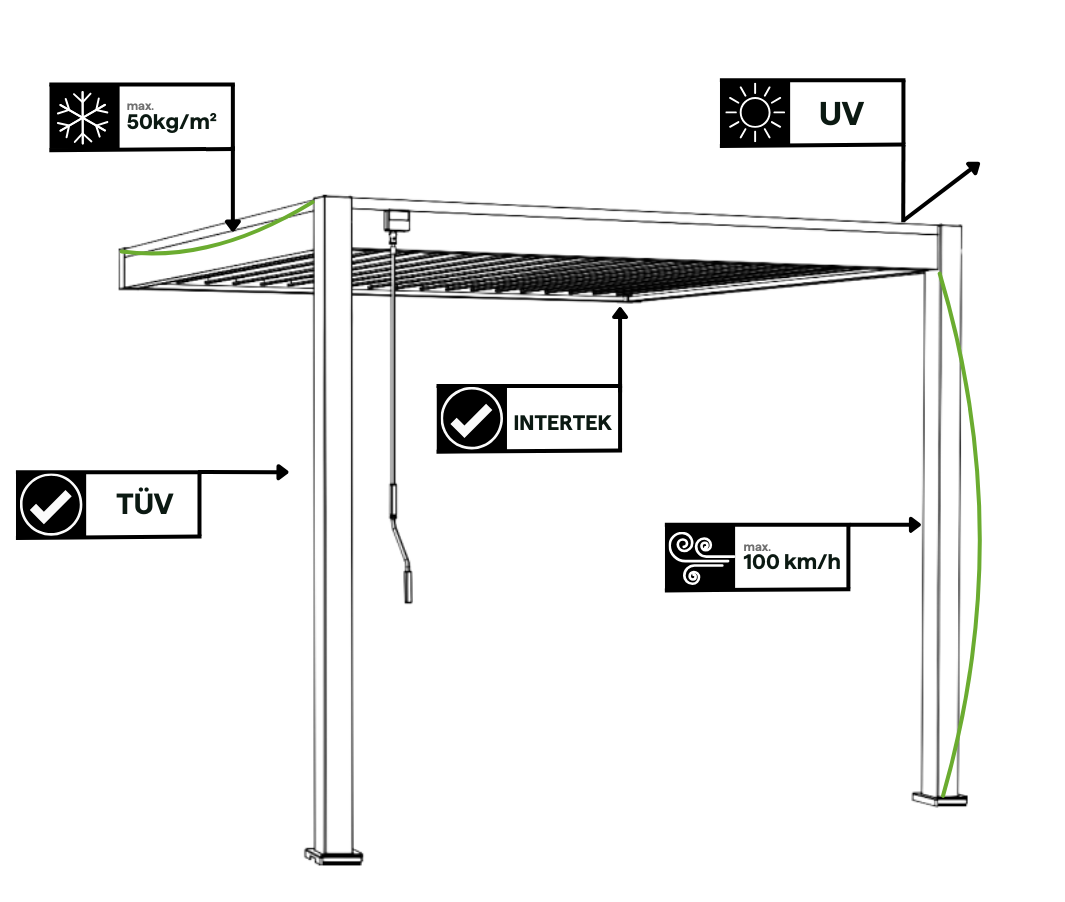 Pergola je odolná voči vetru až 100 km/h, čo zaručuje stabilitu aj pri silnej víchrici. Strecha odolá zaťaženiu snehom do 50 kg/m², takže je vhodná aj počas zimy za miernych zrážok. Kvalitu výrobku potvrdzuje certifikát Intertek a práškovo lakovaná hliníková konštrukcia garantuje odolnosť voči UV žiareniu a korózii, čím chráni pred vyblednutím a poškodením.