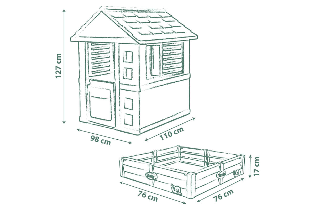 Detský domček na hranie Smoby s pieskoviskom je dokonalým priestorom na kreatívnu hru, ktorá rozvíja predstavivosť a podporuje aktivity na čerstvom vzduchu. Vďaka realistickým detailom a premyslenému dizajnu sa deti môžu cítiť ako v skutočnom domčeku. Posuvné okenice, dvere a dve okná so žalúziami umožňujú rôzne herné aktivity, od hrania rolí až po vytváranie vlastných príbehov. Ako bonus možno pieskovisko s rozmermi 76 x 76 cm použiť aj ako zeleninovú záhradku, ktorá inšpiruje deti k tomu, aby sa naučili starať o rastliny. Pieskovisko nie je trvalo pripevnené, čo umožňuje jeho ľubovoľné umiestnenie, a priložená ochranná plachta ho chráni pred znečistením. Domček na hranie je vyrobený z vysokokvalitného plastu, z ktorého 53 % je recyklovaných, takže je ekologickou voľbou. Povrchová úprava ANTI-UV chráni farby pred vyblednutím, takže domček zostane dlho estetický. Rozmery 174 x 110 x 127 cm poskytujú pohodlný priestor na hranie pre niekoľko detí naraz, zatiaľ čo pevná konštrukcia a zaoblené hrany zaručujú úplnú bezpečnosť. Domček na hranie sa tiež ľahko montuje a čistí, čo ocenia rodičia, ktorí hľadajú odolné a praktické riešenia. Rodičia pri výbere záhradného domčeka pre deti najčastejšie dbajú na jeho bezpečnosť, odolnosť a funkčnosť. Smoby tieto požiadavky spĺňa a ponúka priestor, ktorý možno využiť ako miesto na hranie domčeka, obchod alebo reštauráciu. Vďaka svojmu univerzálnemu dizajnu je ideálny na použitie v záhrade, na terase alebo v priestrannej detskej izbe a poskytuje celoročnú zábavu. Je ideálnou voľbou pre deti vo veku od 2 do 8 rokov, ktoré milujú kreatívnu hru a vonkajšie aktivity.
