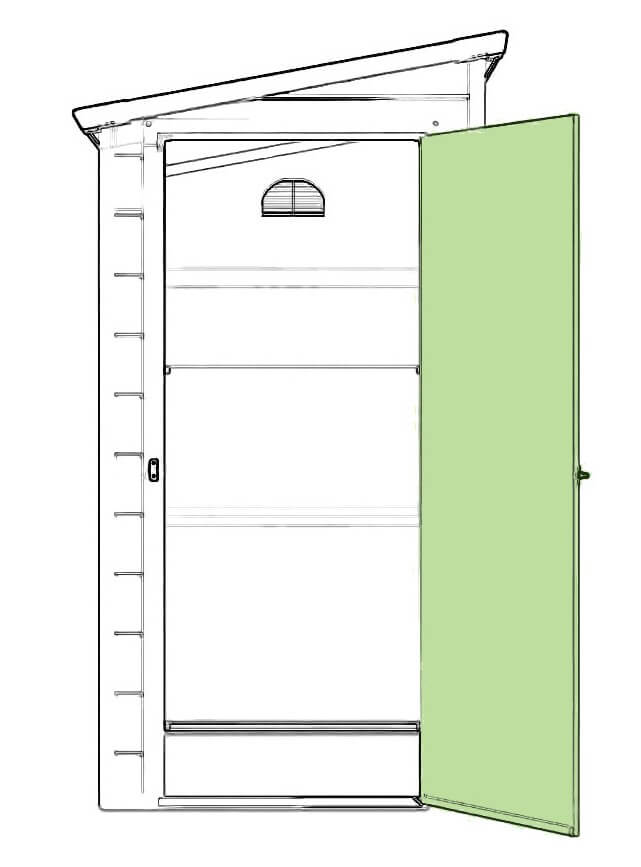 Domček na náradie Boston má jedny dvere na kovových pántoch, ktoré umožňujú bezproblémový prístup do interiéru. Pevne skonštruované dvere uľahčujú každodenné používanie domčeka a zaručujú odolnosť a pohodlie za každých podmienok.