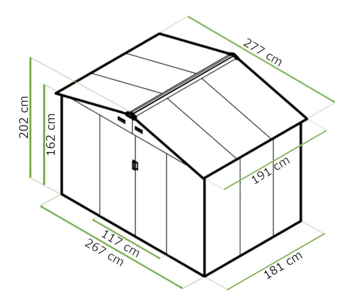 HUDSON 277x191 cm je robustný domček na náradie s rozlohou 4,83 m², ideálny na uskladnenie záhradného náradia a iného vybavenia. Pozinkovaná oceľová konštrukcia poskytuje pevnosť a odolnosť proti korózii, čo umožňuje použitie v akýchkoľvek poveternostných podmienkach. Posuvné dvojité dvere uľahčujú používanie interiéru, pričom možnosť zabezpečenia visiacim zámkom zvyšuje bezpečnosť uložených predmetov. Vetracie otvory účinne chránia interiér pred vlhkosťou, čím zabraňujú vzniku plesní.