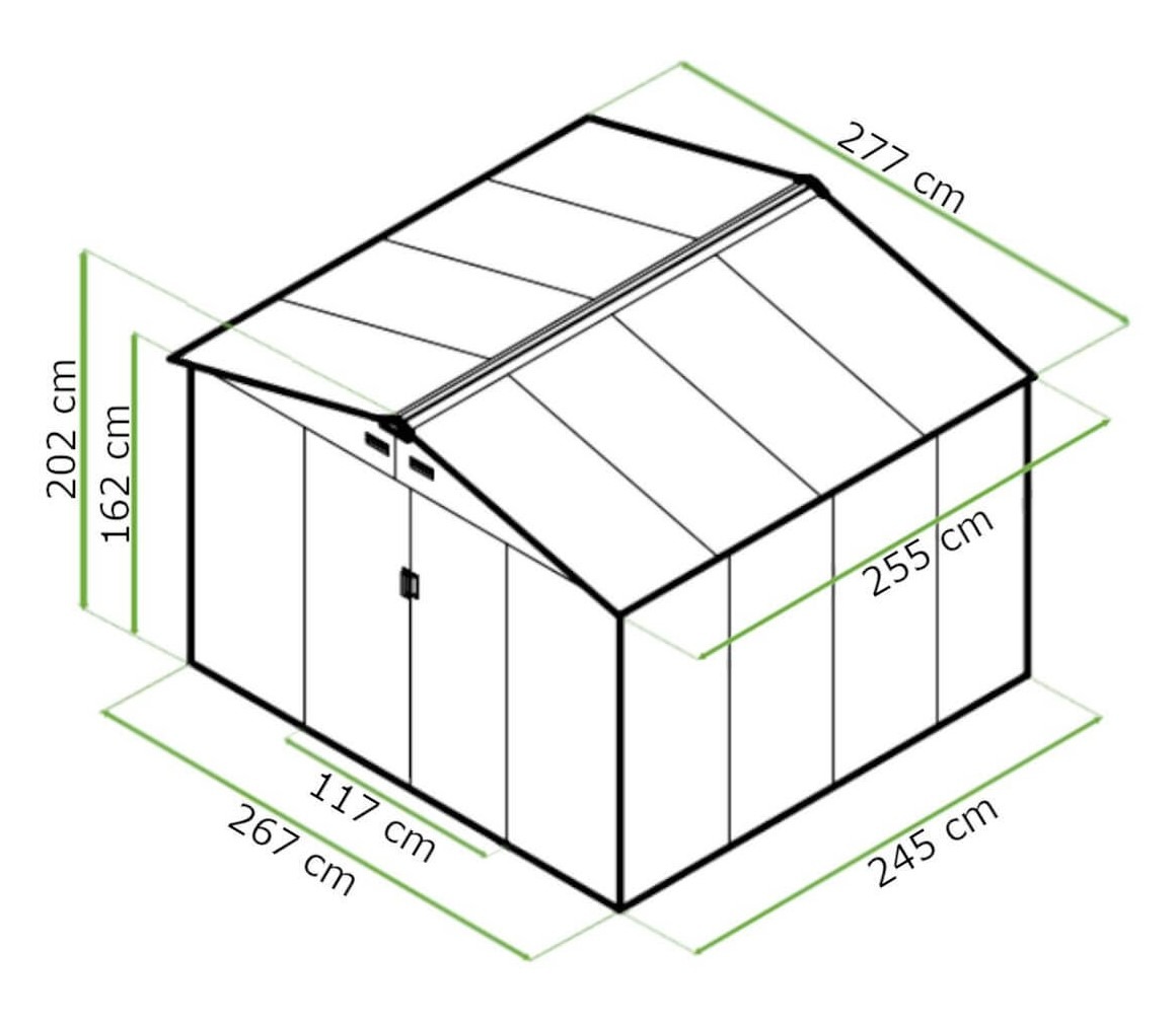 Domček na náradie HUDSON - 277x255 cm ponúka úžitkovú plochu 6,5 m², ktorá je ideálna na uskladnenie náradia a záhradného vybavenia. Robustná pozinkovaná oceľová konštrukcia sa vyznačuje výnimočnou trvanlivosťou a odolnosťou proti korózii, vďaka čomu je domček ideálny na použitie za každého počasia. Dvojité posuvné dvere uľahčujú prístup do interiéru a možnosť ich uzamknutia visiaci zámok zvyšuje ochranu obsahu. Vetracie otvory účinne znižujú vlhkosť, čím chránia náradie pred koróziou a plesňami.