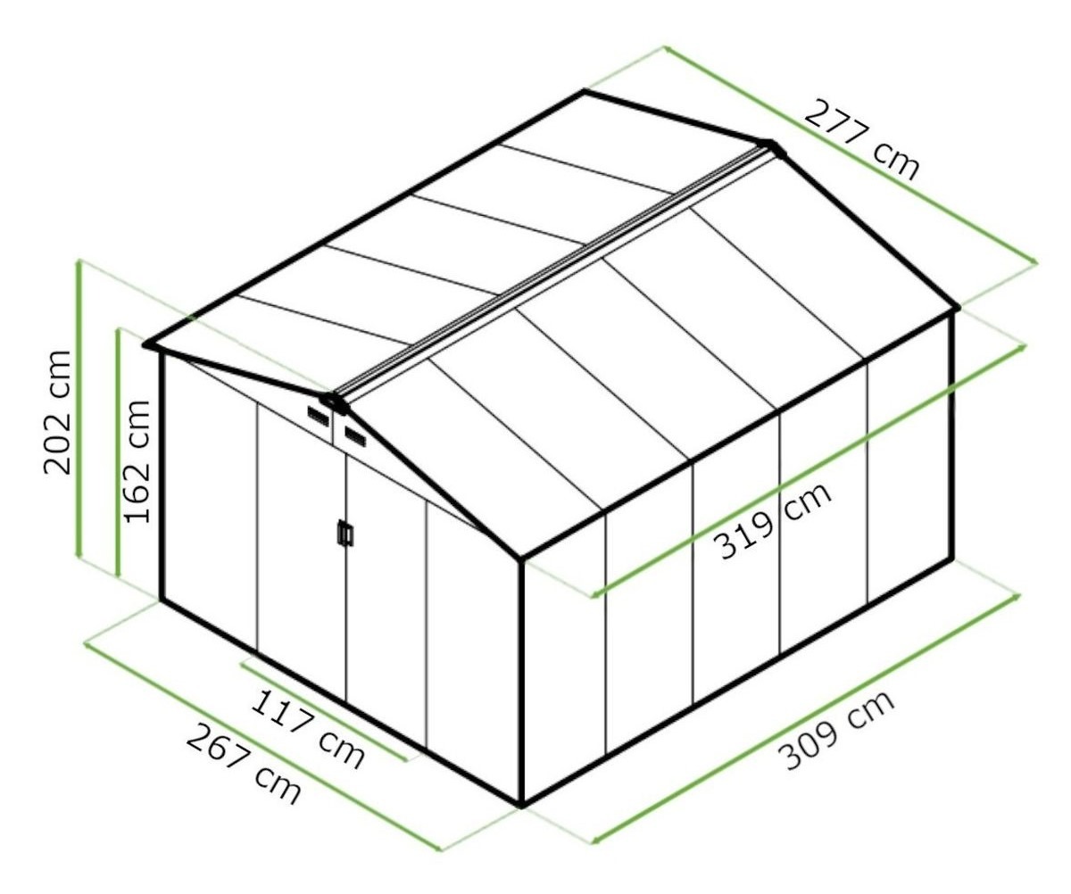 Domček na náradie HUDSON 277x319 cm ponúka úžitkovú plochu 8,25 m², ktorá je ideálna na záhradné vybavenie a náradie. Konštrukcia je vyrobená z pozinkovanej ocele, čo zabezpečuje mimoriadnu odolnosť a ochranu proti korózii, čím garantuje spoľahlivé používanie za každého počasia. Dvojité posuvné dvere zaručujú jednoduchý prístup do interiéru, pričom možnosť ich zabezpečenia visiaci zámkom zvyšuje úroveň ochrany. Vďaka štyrom vetracím otvorom prístrešok účinne znižuje vlhkosť, čím chráni obsah pred plesňami a hrdzou. Praktické okno prepúšťa do prístrešku prirodzené svetlo.