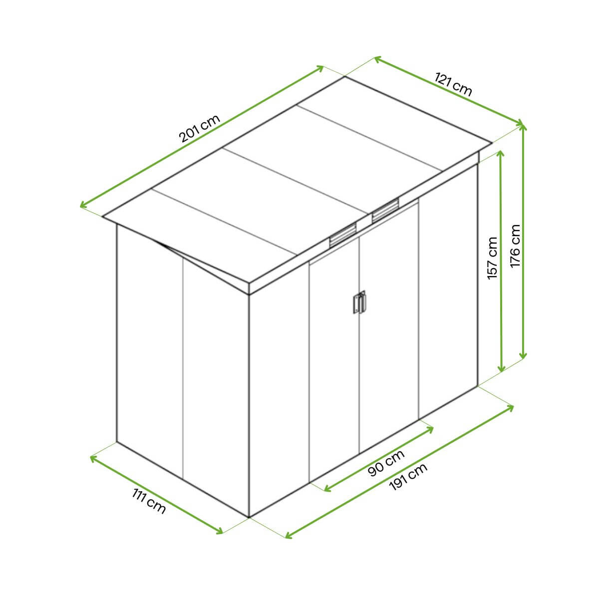 Domček na náradie Hardmaister model OREGON s rozmermi 201 × 121 cm je robustné riešenie na uskladnenie záhradného náradia a vybavenia. Je vyrobený z pozinkovanej ocele a vyznačuje sa odolnosťou proti korózii a dlhou životnosťou. Posuvné dvere umožňujú pohodlný prístup a vetracie otvory účinne chránia pred vlhkosťou a plesňami. Posuvné dvere možno uzamknúť visiacim zámkom pre väčšiu bezpečnosť (visiaci zámok nie je súčasťou dodávky). Jednoduchá montáž a žiadna údržba robia z tohto domčeka na náradie praktickú voľbu pre každého majiteľa záhrady.