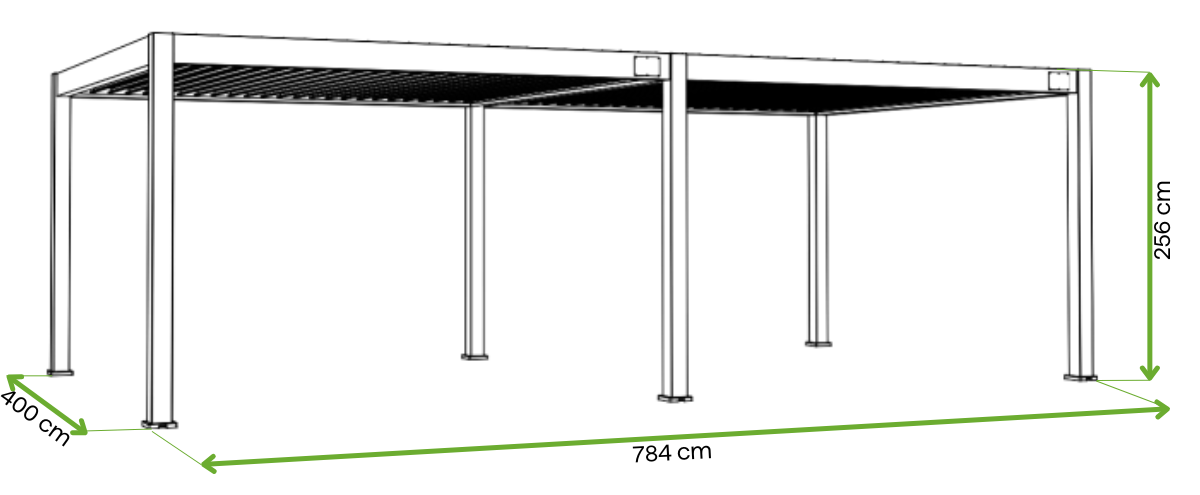 Rozmery pergoly: 400 × 784 × 256 cm
