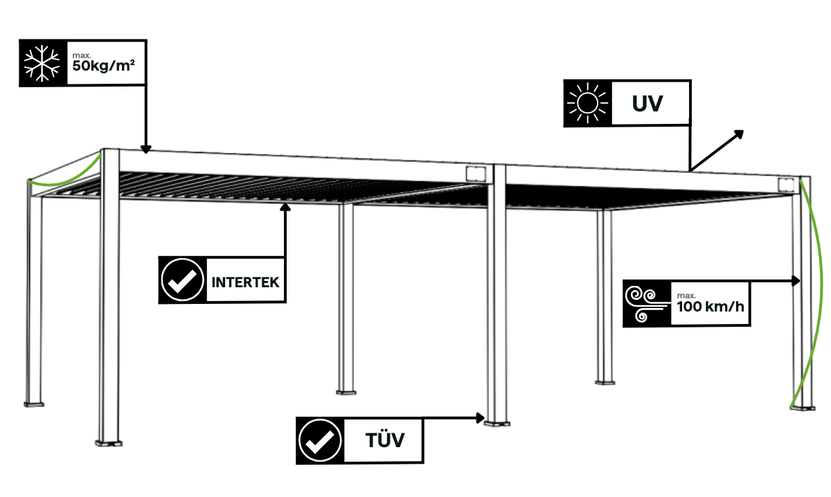 Pergola Gutroof DELUXE bola navrhnutá s ohľadom na celoročnú spoľahlivosť. Robustná hliníková konštrukcia je odolná voči korózii, UV žiareniu a meniacim sa poveternostným podmienkam. Bez problémov zvládne vietor až do 100 km/h a zaťaženie snehom do 50 kg/m². Jej kvalitu a odolnosť potvrdzujú certifikáty TÜV a Intertek.