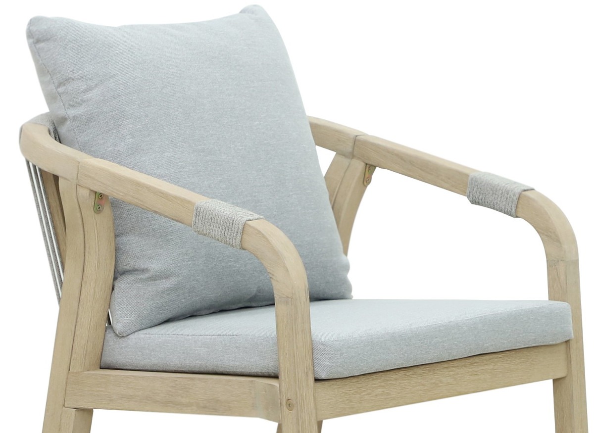 Rám nábytku je vyrobený z masívneho akáciového dreva, ktoré zaručuje stabilitu, trvácnosť a odolnosť voči vonkajším podmienkam. Premyslená konštrukcia so zosilnenými spojmi garantuje bezpečné používanie počas mnohých sezón. Vankúše sú potiahnuté polyesterovou tkaninou, ktorá je odolná voči vlhkosti a UV žiareniu – materiál rýchlo schne a zachováva si estetický vzhľad aj pri používaní v exteriéri.