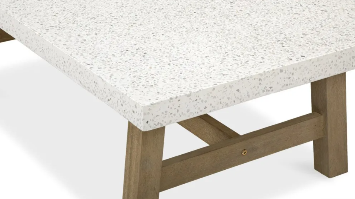 Konferenčný stôl kombinuje robustnú podnož z akáciového dreva s dekoratívnou cementovou doskou vo vzhľade terrazzo. Je odolný voči každodennému používaniu a jeho elegantný dizajn dodáva súprave charakter a moderný štýl.