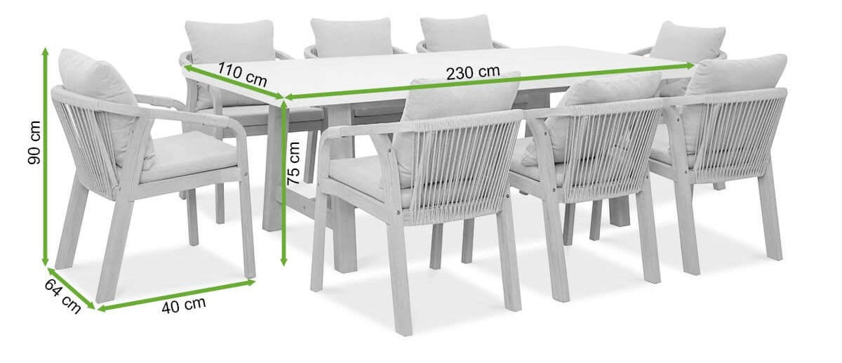 Jedálenská súprava Jacob 8+1 od spoločnosti Furrore je reprezentatívna súprava záhradného nábytku vyrobená z odolného akáciového dreva. Súprava obsahuje veľký stôl a osem pohodlných stoličiek. Konštrukcia z masívneho dreva zaručuje stabilitu, zatiaľ čo vankúše podčiarkujú komfort a elegantný charakter súpravy, čím vytvárajú štýlový priestor na spoločné posedenie na terase alebo v záhrade.