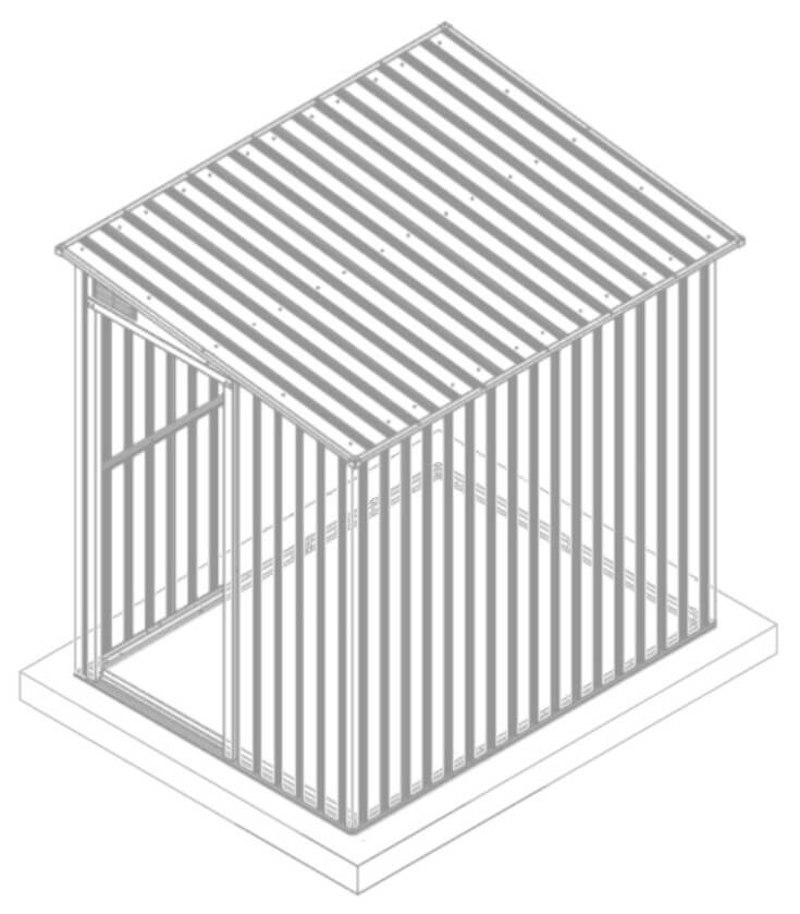 Pred začatím montáže sa uistite, že betónový poter je rovný a úplne suchý. Inštalácia domčeka na nerovnom povrchu môže viesť k nestabilite. Kotvy do zeme nie sú súčasťou súpravy.