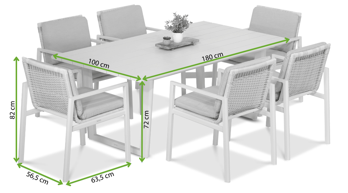 Jedálenský set Lotus 6+1 Dining White od spoločnosti Furrore je elegantný set pre šesť osôb, ktorý obsahuje veľký 180 cm stôl a šesť kresiel s mäkkými vankúšmi. Základom konštrukcie je práškovo lakovaný hliník a sedadlá a operadlá majú povrchovú úpravu z odolného technorattanu. Svetlé farby a moderný dizajn robia zo súpravy štýlovú a funkčnú voľbu do záhrady alebo na terasu.