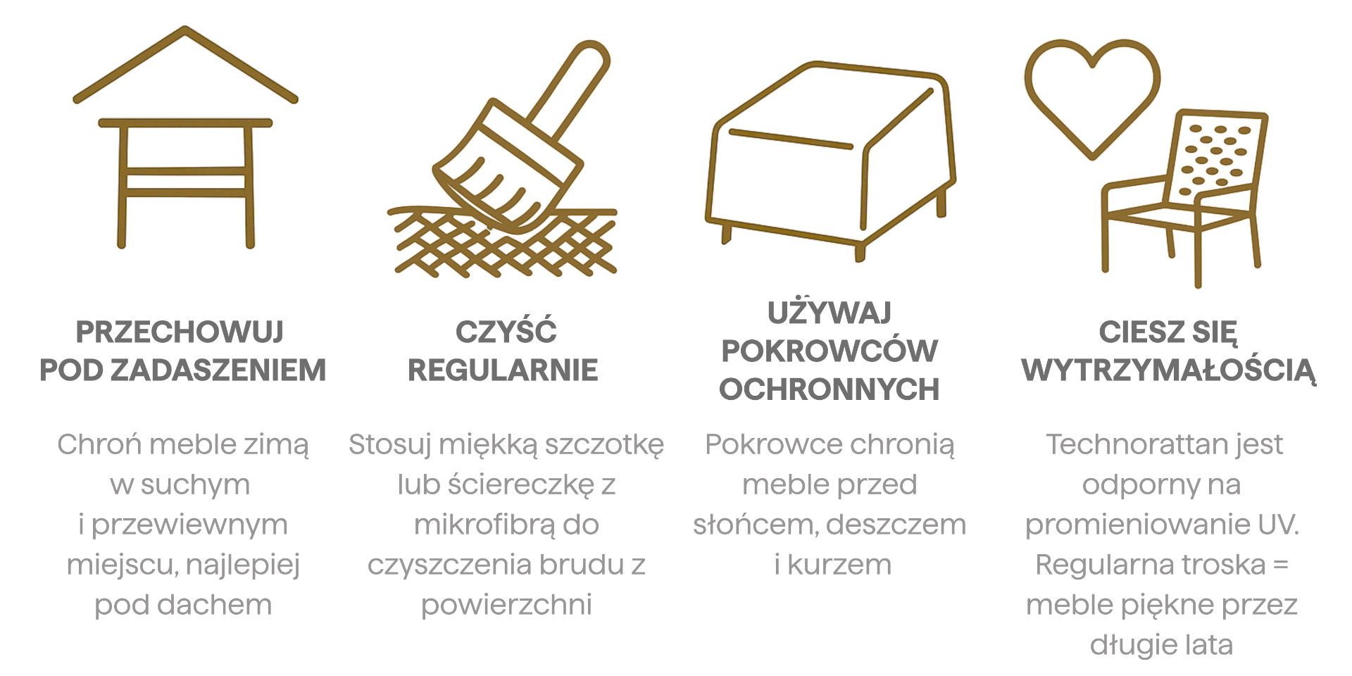 Technorattan je materiál s vysokou odolnosťou voči vonkajším podmienkam, ale ako každý záhradný materiál si vyžaduje základnú starostlivosť. Aby ste si mohli užívať ich estetiku a pohodlie po mnoho sezón, stačí si zapamätať niekoľko pravidiel: