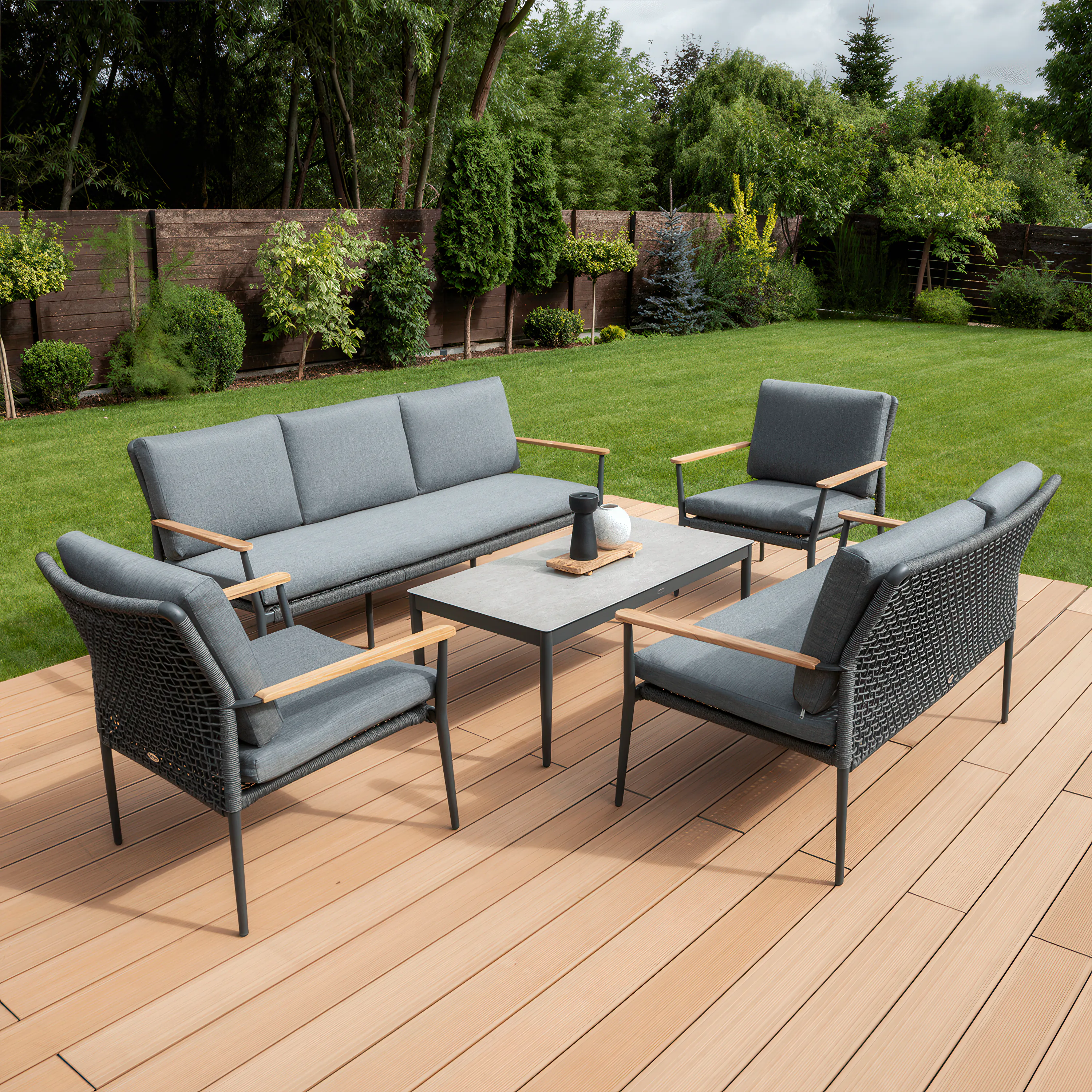 Objavte jedinečný rozmer relaxu na terase so súpravou nábytku Furrore LUNA GRANDE CAFFE Dark Grey. Kolekcia vyžaruje eleganciu a luxus a vytvára dokonalé miesto na relaxáciu a trávenie času na čerstvom vzduchu. Súprava pozostáva z trojmiestnej pohovky s rozmermi 196,5 x 82 x (V)85 cm, dvojmiestnej pohovky s rozmermi 136,5 x 82 x (V)85 cm, dvoch kresiel s rozmermi 76,5 x 82 x (V)85 cm a stola s rozmermi 120 x 60 x (V)45 cm. Konštrukcia nábytku je vyrobená z hliníka, ktorý je obšitý nylonovou šnúrou, čo mu dodáva moderný vzhľad. Podrúčky z teakového dreva dodávajú nábytku sofistikovaný nádych. Dosku stola zdobí keramické sklo, ktoré nielenže krásne vyzerá, ale je aj odolné a ľahko sa čistí. Hrúbka stolovej dosky je 5 cm, čo poskytuje stolu pevnosť a stabilitu. Vankúše na sedenie majú hrúbku 8 cm, čo poskytuje pohodlie a komfort pri sedení.