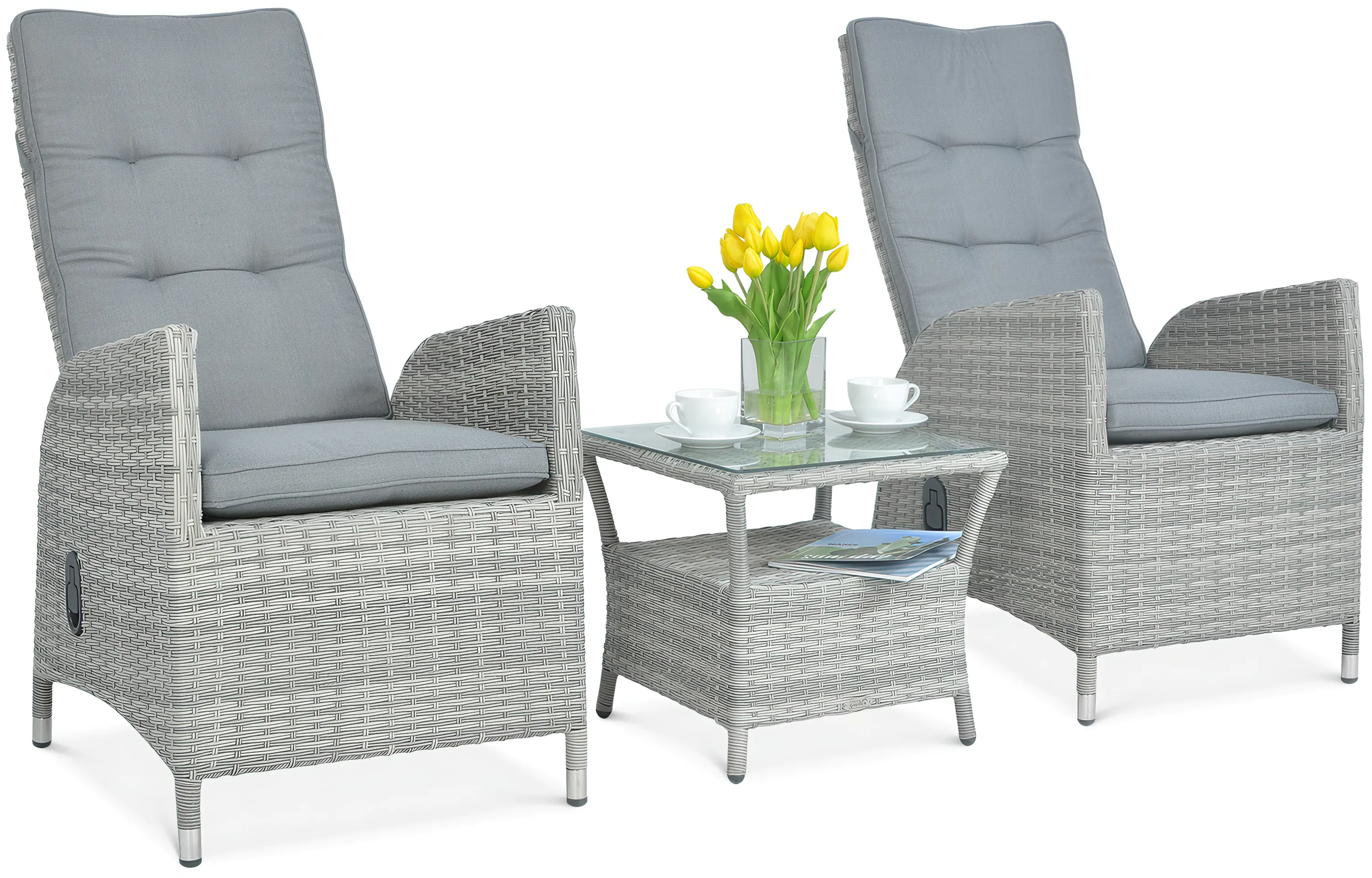Dvojmiestna súprava Malta Duo Stone Grey je mimoriadne pohodlná a funkčná obývacia súprava pre 2 osoby, ktorá sa skladá z 3 prvkov. Kreslá sú vybavené vysokými operadlami, ktoré majú navyše plynulé hydraulické nastavenie uhla, čím sa zabezpečí maximálna relaxácia a odpočinok. Celú súpravu dopĺňa elegantný konferenčný stolík so sklenenou doskou a spodnou poličkou - napríklad na knihy, noviny alebo čokoľvek iné, čo sa oplatí mať počas záhradného relaxu po ruke. Základom celého nábytku je odolná, stabilná konštrukcia z ocele a celý kus je zakončený pleteným technorattanom v sivej farbe. Kreslá aj stôl z obývacej súpravy Malta Duo sú zachované v jednotnom módnom štýle. Vynikajúci vzhľad sprevádza množstvo mimoriadne užitočných funkcií. Nábytok z technorattanu v obývacej súprave Malta Duo Stone Grey je odolný voči UV žiareniu a zrážkam. Okrem toho nepotrebujú žiadnu špeciálnu starostlivosť, aby si zachovali svoj dokonalý vzhľad. Stačí umývanie vodou alebo vlhkou handričkou, akákoľvek impregnácia je úplne zbytočná. Spríjemnite si zaslúžený odpočinok s obývačkovou súpravou Malta Duo v sivom technorattane!