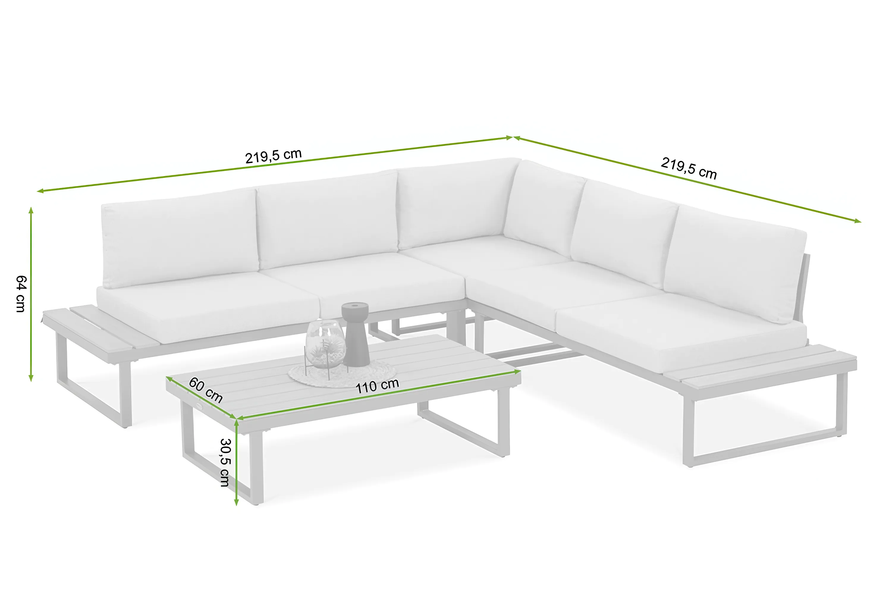 - celá rohová sedacia súprava: dĺžka - 219,5 cm, šírka - 219,5 cm, výška - 64 cm