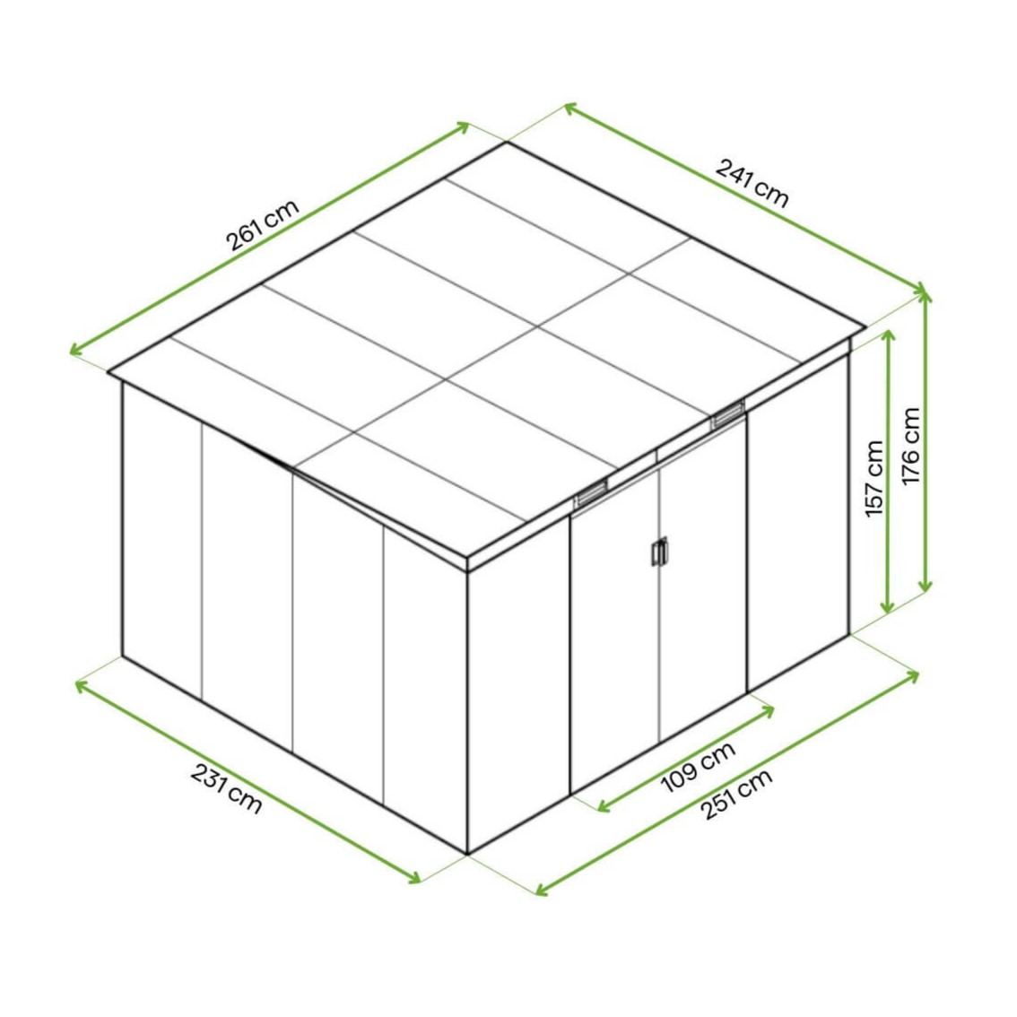 Hardmaister OREGON 261x241 cm je moderný domček na náradie so štýlovým dizajnom a robustnou konštrukciou. Pozinkovaná oceľ zaručuje odolnosť proti korózii a dlhú životnosť. Posuvné dvere umožňujú ľahký prístup a vetracie otvory zlepšujú cirkuláciu vzduchu, čím chránia interiér pred vlhkosťou. Možnosť uzamknutia dverí visiacim zámkom zvyšuje ochranu obsahu. Kovové panely so štruktúrou pripomínajúcou dosku v béžovej farbe dodávajú elegantný vzhľad. Šikmá plechová strecha účinne odvádza vodu a chráni domček pred preťažením a poškodením.