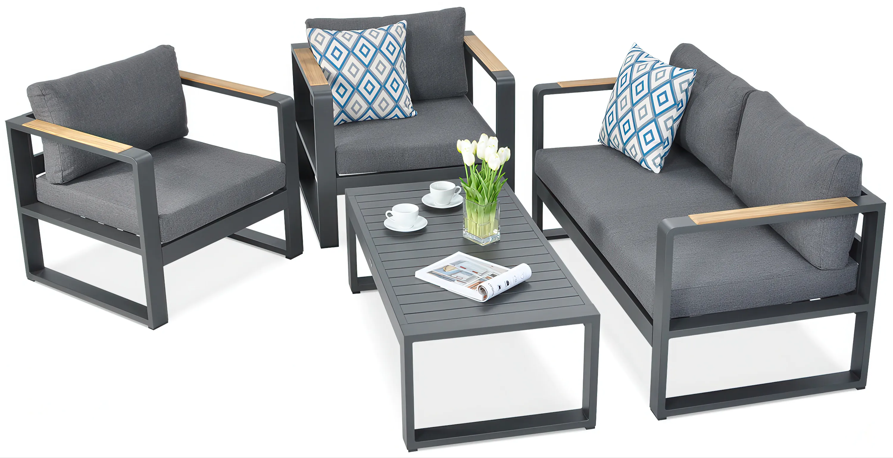 4 kusy nábytku a mnoho využití, sedacia súprava Panama Anthracite obsahuje dvojmiestnu pohovku, dve rozšírené kreslá a konferenčný stolík. Všetky prvky spája fantastický dizajn, pevné spracovanie a mimoriadna životnosť. Záhradný nábytok zo sedacej súpravy Panama je vyrobený z hliníka – materiálu ľahkého, a zároveň veľmi odolného. Súprave Panama Anthracite neublížia ani poveternostné vplyvy, ani slnečné žiarenie, ani prudké výkyvy teplôt. Trvácnosť hliníkového záhradného nábytku z neho robí vynikajúcu voľbu pre najnáročnejších používateľov. Sedaciu súpravu Panama v antracitovej farbe môžete umiestniť v záhrade pri dome, v obývacej izbe alebo na hotelovej či reštauračnej terase. Vždy vyzerá výborne a poskytuje používateľom najvyšší komfort. Estetickým prvkom sedacej súpravy Panama Anthracite sú určite drevené vsadky na podrúčkach kresiel a pohovky. Súčasťou záhradného nábytku sú veľké, mäkké vankúše na sedenie aj operadlá. Súprava nábytku Panama je tiež veľmi jednoduchá na údržbu. Nevyžaduje dodatočnú ochranu proti korózii a všetky nečistoty sa zvyčajne dajú odstrániť čistou vodou.