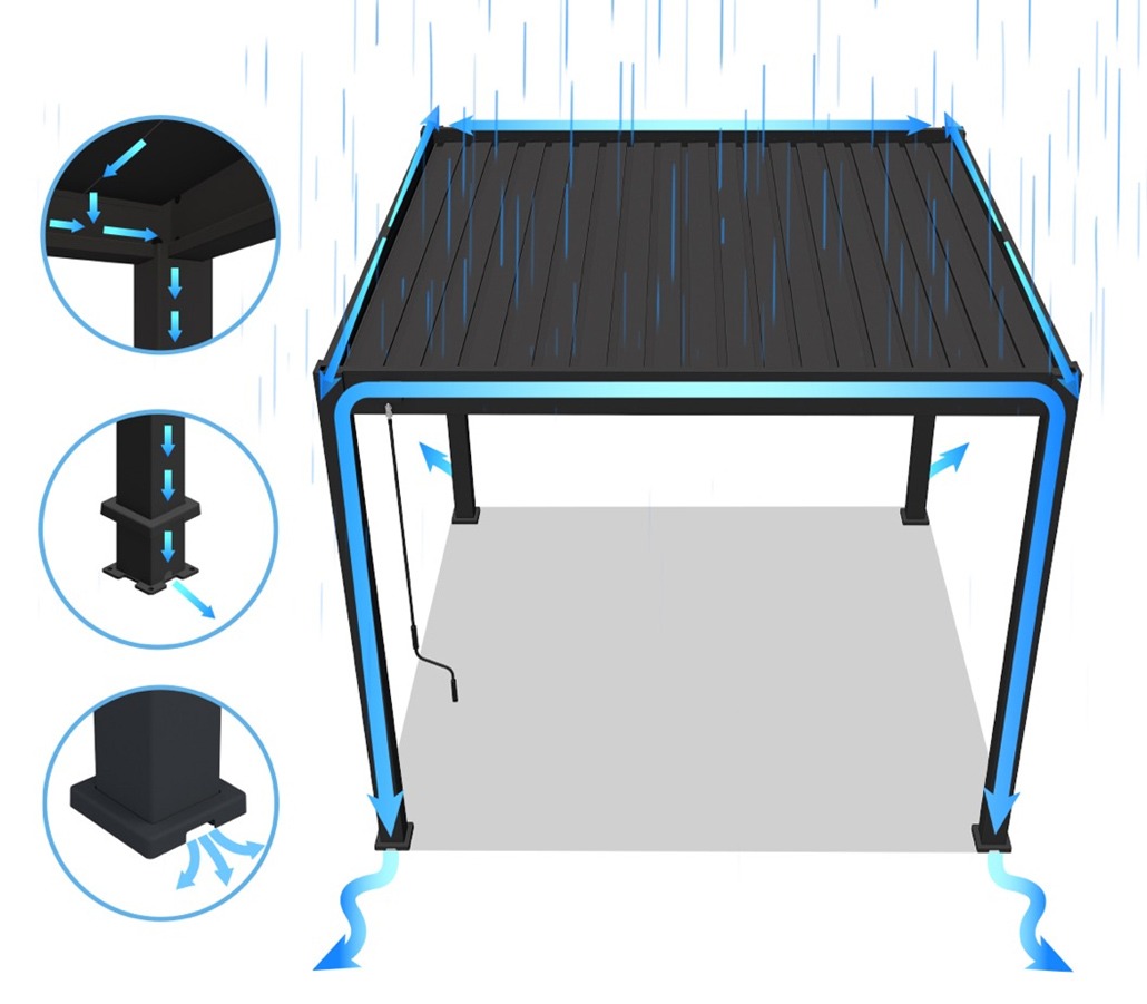 Pergola je vybavená moderným systémom odvodnenia, ktorý účinne odvádza zrážky mimo oddychovej zóny. Vďaka dômyselnej konštrukcii sa voda nehromadí na povrchu strechy, čo zvyšuje komfort používania aj počas daždivého počasia. Toto praktické riešenie vám umožní užívať si relax na čerstvom vzduchu bez obáv z meniaceho sa počasia.