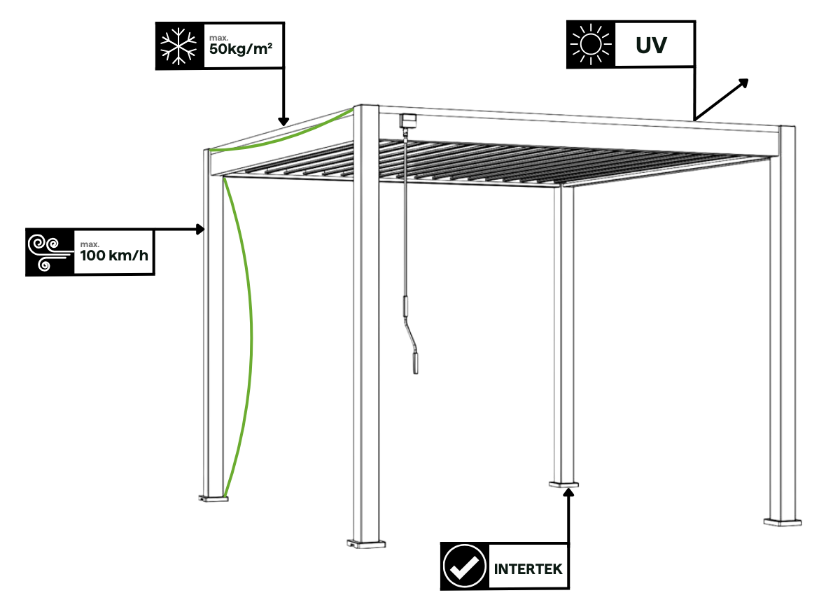 Pergola bola navrhnutá s dôrazom na trvanlivosť a odolnosť voči nepriaznivým poveternostným podmienkam. Konštrukcia odolá nárazom vetra s rýchlosťou až 100 km/h, čo zaisťuje stabilitu aj pri silných nárazoch. Strecha je dimenzovaná na zaťaženie snehom do 50 kg/m², takže sa osvedčí aj v zime pri miernych snehových zrážkach. Robustný hliník s práškovou povrchovou úpravou garantuje odolnosť proti UV žiareniu a korózii, chráni konštrukciu pred vyblednutím a poškodením. Vysokú kvalitu produktu potvrdzuje certifikát Intertek.
