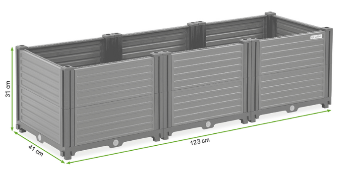 Cultivo GROW BOX L je priestranný pestovateľský box, ideálny na pestovanie zeleniny, byliniek a kvetov v záhrade, na terase a balkóne. S rozmermi 123 × 41 × 31 cm poskytuje veľkú pestovateľskú plochu, čo umožňuje efektívne hospodárenie s priestorom. Odolný polypropylén, odolnosť voči UV žiareniu a poveternostným vplyvom a hrubé bočné panely (2,16 mm) zaručujú trvanlivosť na dlhé roky. Vďaka rýchlej montáži bez použitia náradia je box pripravený na použitie v priebehu niekoľkých okamihov. Kompatibilita so súpravou GROW BOX KIT umožňuje rozšíriť a prispôsobiť pestovateľský priestor vašim potrebám.