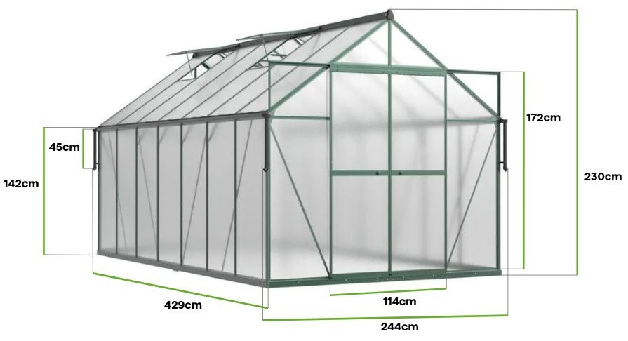 Polykarbonátový skleník do záhrady Slide-In NEW 244x429cm Dark Green od Cultivo s vystuženou konštrukciou je ideálnym riešením pre náročných záhradníkov, ktorí ocenia funkčnosť a odolnosť. Tmavozelená farba sa dokonale hodí do záhradného prostredia a vytvára harmonickú a prirodzenú kompozíciu. Vďaka svojim veľkým rozmerom – dĺžka 429 cm a šírka 244 cm – ponúka tento priestranný skleník ideálne podmienky na pestovanie zeleniny, ovocia, kvetov a byliniek, čím vám umožňuje realizovať aj tie najambicióznejšie záhradnícke plány. Skleník je vyrobený z 4 mm hrubých polykarbonátových panelov s UV ochranou, ktoré účinne chránia rastliny pred intenzívnym slnečným žiarením a meniacimi sa poveternostnými podmienkami, čím zabezpečujú stabilné mikroklíma. Robustný rám z hliníkovej zliatiny a pozinkovaná oceľová základňa zaručujú odolnosť voči vonkajším vplyvom a dlhodobú životnosť. Skleník je vybavený inovatívnym montážnym systémom Slide-In, ktorý umožňuje rýchle a jednoduché vkladanie panelov, čím sa eliminuje potreba tradičných spôn, čo ďalej zvyšuje stabilitu konštrukcie. Dve dodatočné horizontálne priečky posilňujú strechu skleníka, čím sa zvyšuje jej odolnosť voči zaťaženiu snehom a nárazom vetra. Dvojité posuvné dvere s rozmermi 172 x 114 cm poskytujú pohodlný prístup a štyri vetracie okná zabezpečujú optimálnu cirkuláciu vzduchu. Vstavaná 45 cm dažďová rímsa, umiestnená vo výške 97 cm, umožňuje ekologický zber dažďovej vody, čím podporuje udržateľné zavlažovanie plodín.