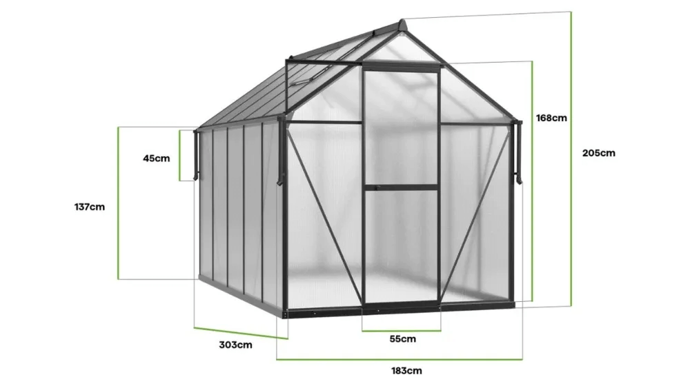 Záhradný skleník z polykarbonátu Slide-In NEW 183x303cm Black od Cultivo s vyztuženou konštrukciou je ideálny pre tých, ktorí chcú vo svojej záhrade vytvoriť profesionálne podmienky na pestovanie rastlín. Vyniká moderným dizajnom a čiernym povrchom, ktorý mu dodáva jedinečný charakter. S dĺžkou 303 cm ponúka dostatok priestoru pre vaše rastliny, vďaka čomu môžete ľahko pestovať zeleninu, kvety a bylinky. Odolné polykarbonátové panely s hrúbkou 4 mm s UV ochranou účinne rozptyľujú slnečné svetlo, čím poskytujú rastlinám ideálne podmienky na rast a zároveň ich chránia pred škodlivým žiarením. Pevná hliníková konštrukcia a pozinkovaná oceľová základňa zaručujú odolnosť a odolnosť voči meniacim sa poveternostným podmienkam. Inovatívny montážny systém Slide-In uľahčuje montáž skleníka, zvyšuje stabilitu celej konštrukcie a eliminuje potrebu spôn. S dvoma vetracími oknami a posuvnými dverami skleník ponúka optimálnu cirkuláciu vzduchu a ľahký prístup do interiéru. Jeho premyslený dizajn umožňuje efektívne využitie priestoru a jeho estetika z neho robí nielen funkčný, ale aj dekoratívny prvok záhrady.