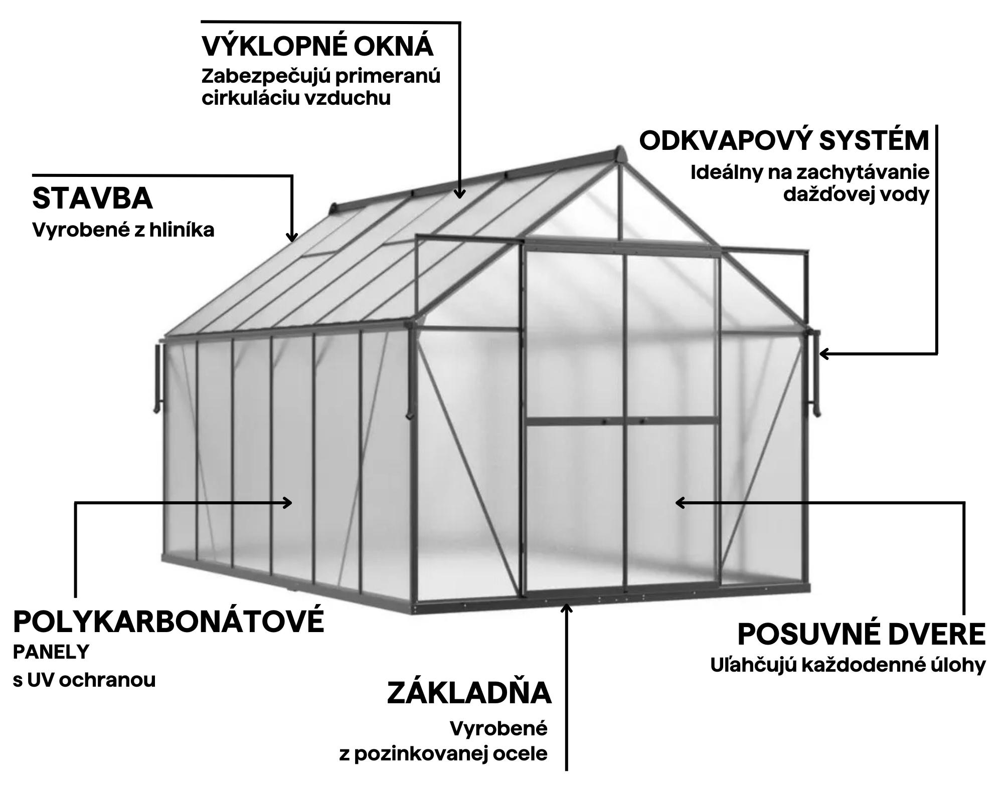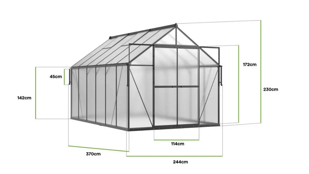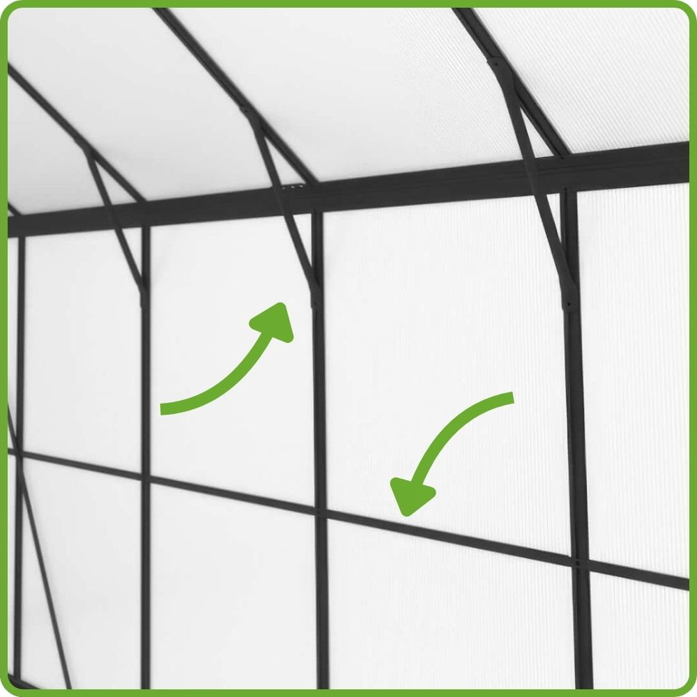 s vystuženou konštrukciou je priestranným a funkčným riešením pre milovníkov záhradníctva. Jeho čierna konštrukcia vyniká nielen svojím dizajnom, ale aj dokonale zapadá do akéhokoľvek prostredia a vytvára moderný akcent vo vašej záhrade. S šírkou 244 cm a dĺžkou 370 cm ponúka tento model mimoriadne veľký priestor, ideálny na pestovanie zeleniny, ovocia, byliniek a kvetov vo väčšom meradle. Polykarbonátové panely s hrúbkou 4 mm, vybavené UV ochranou, zaručujú ideálne podmienky pre rastliny tým, že rozptyľujú slnečné svetlo a chránia pred jeho škodlivými účinkami. Robustný rám z hliníkovej zliatiny a pozinkovaná oceľová základňa zaisťujú odolnosť a odolnosť voči poveternostným vplyvom. Vďaka inovatívnemu montážnemu systému Slide-In sa zasúvacie panely ľahko inštalujú a zaisťujú stabilitu konštrukcie na dlhé roky. V skleníku sú umiestnené dve horizontálne priečky, ktoré zabezpečujú stabilitu a minimalizujú riziko poškodenia konštrukcie snehom alebo vetrom. Dvojité posuvné dvere s rozmermi 172 x 114 cm poskytujú pohodlný prístup do interiéru a štyri vetracie okná umožňujú efektívnu cirkuláciu vzduchu, čo podporuje zdravý rast rastlín. Ďalšou výhodou je praktická dažďová rímsa, zavesená vo výške 97 cm, ktorá umožňuje zachytávať dažďovú vodu na ekologické a ekonomické zavlažovanie plodín.