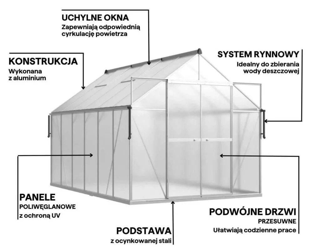 Hluboké a odolné hliníkové profily posilňujú konštrukciu skleníka, zvyšujú jej odolnosť proti deformácii, zaťaženiu snehom a silnému vetru. Vďaka tomu je konštrukcia nielen odolnejšia, ale zaručuje aj dlhodobé a bezproblémové používanie aj v náročných poveternostných podmienkach.