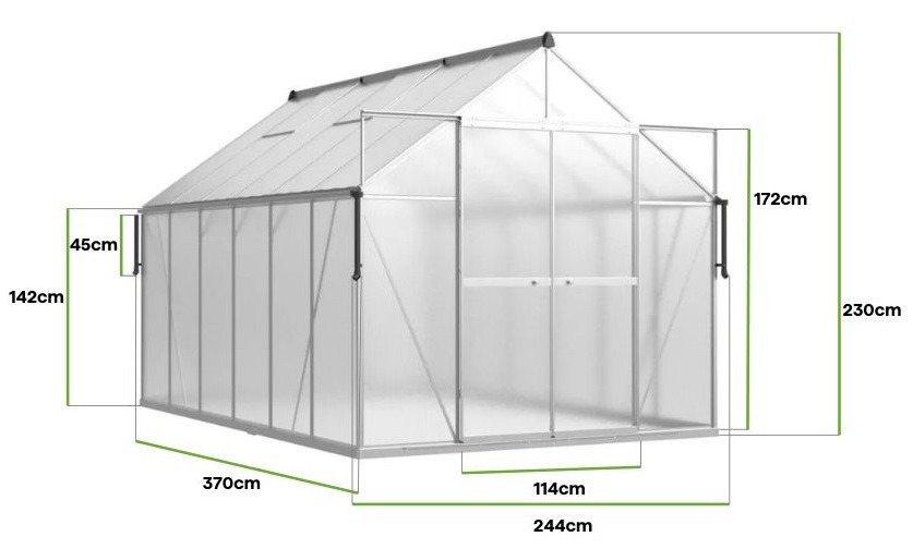 Polykarbonátový záhradný skleník Slide-In NEW 244x370cm Silver od Cultivo s vystuženou konštrukciou spája priestrannosť, odolnosť a moderný dizajn. Strieborná konštrukcia mu dodáva elegantný vzhľad, ktorý dokonale zapadá do klasických aj moderných záhradných úprav. Vďaka svojim impozantným rozmerom – dĺžka 370 cm a šírka 244 cm – skleník ponúka dostatok priestoru na pestovanie rôznych rastlín, od zeleniny a ovocia až po kvety a bylinky. Skleník je vybavený 4 mm hrubými polykarbonátovými panelmi s UV ochranou, ktoré vytvárajú ideálne prostredie pre rast rastlín a chránia ich pred intenzívnym slnečným žiarením a meniacimi sa poveternostnými podmienkami. Hliníkový rám a pozinkovaná oceľová základňa zaisťujú stabilitu a dlhú životnosť aj v náročných podmienkach. Inovatívny systém Slide-In umožňuje rýchlu inštaláciu posuvných panelov, čím sa eliminuje potreba tradičných spôn a zároveň sa zaisťuje väčšia stabilita. Dvojité posuvné dvere s rozmermi 172 x 114 cm a štyri vetracie okná poskytujú pohodlný prístup do interiéru a optimálne vetranie. Tento model je tiež vybavený praktickou dažďovou žľabom, zaveseným vo výške 97 cm, ktorý umožňuje zber dažďovej vody – ekologické riešenie, ktoré podporuje šetrenie vodou v záhrade. Vyberte si Cultivo a vytvorte si perfektné podmienky pre svoje záhradkárske vášne!