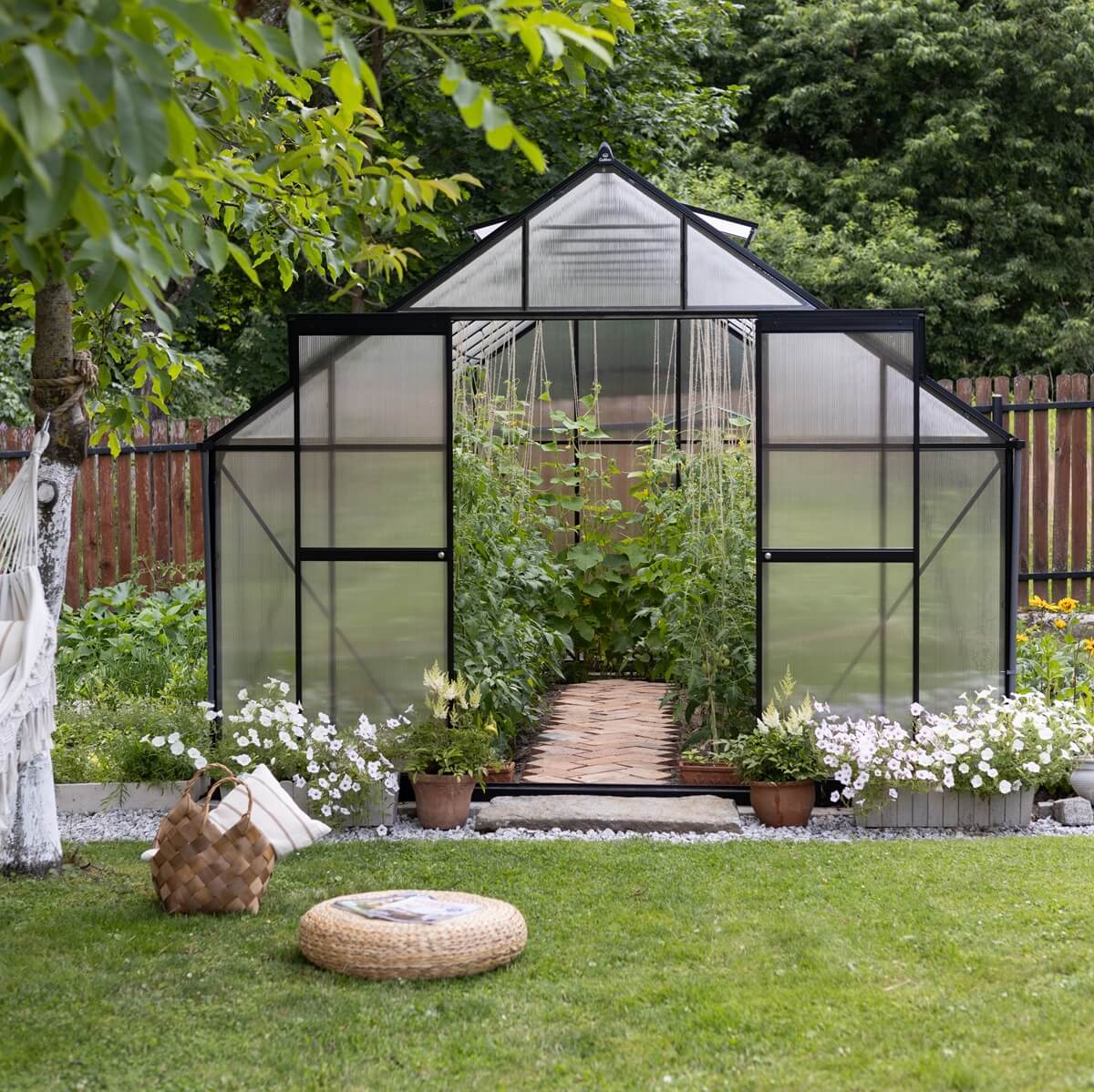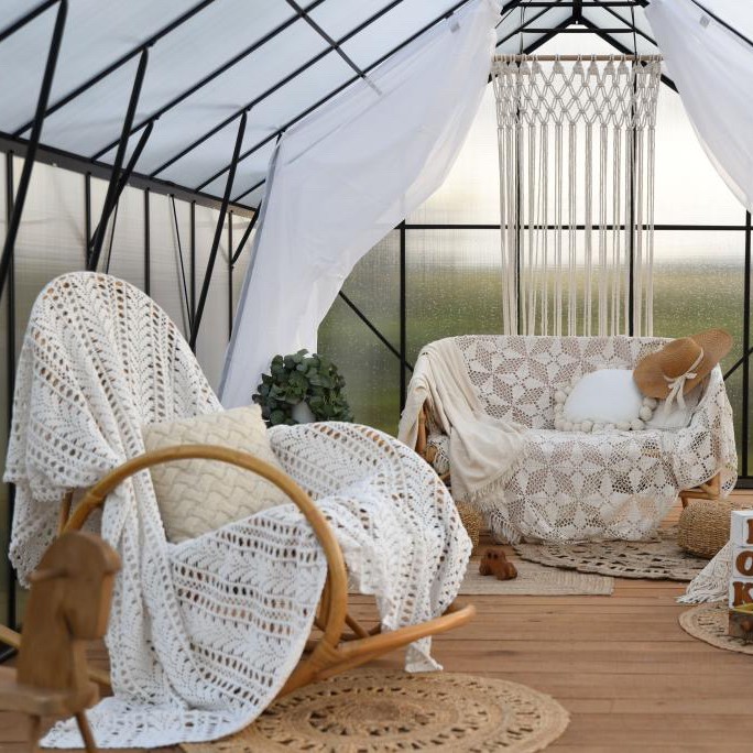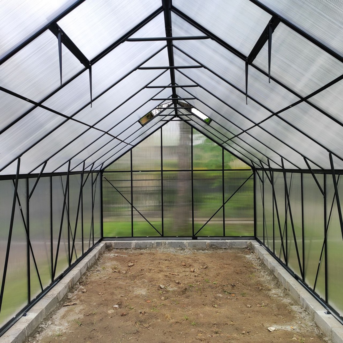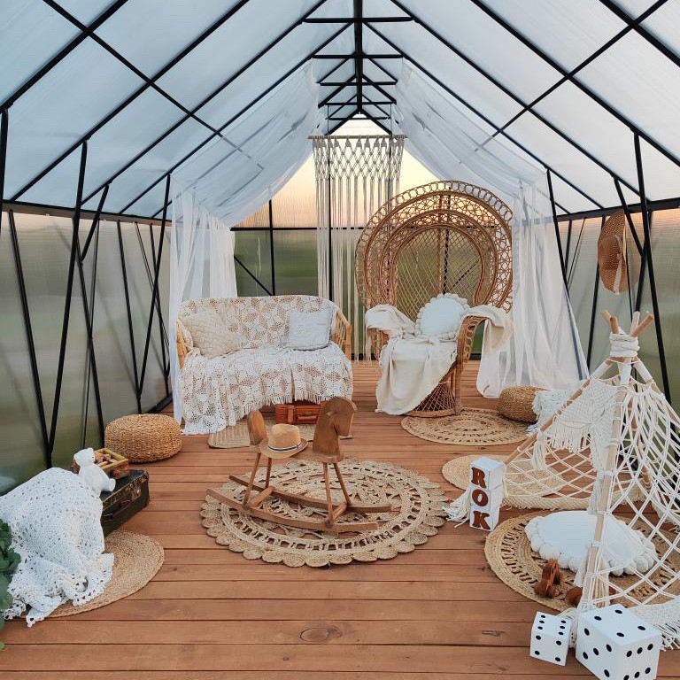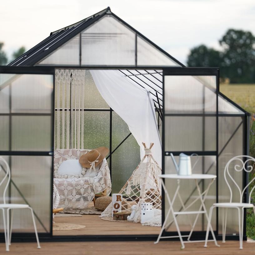 Diagonálne priečky a horizontálne nosníky zvyšujú pevnosť a tuhosť skleníka, zatiaľ čo zladená farba harmonizuje s rámom a vytvára jednotný vzhľad.