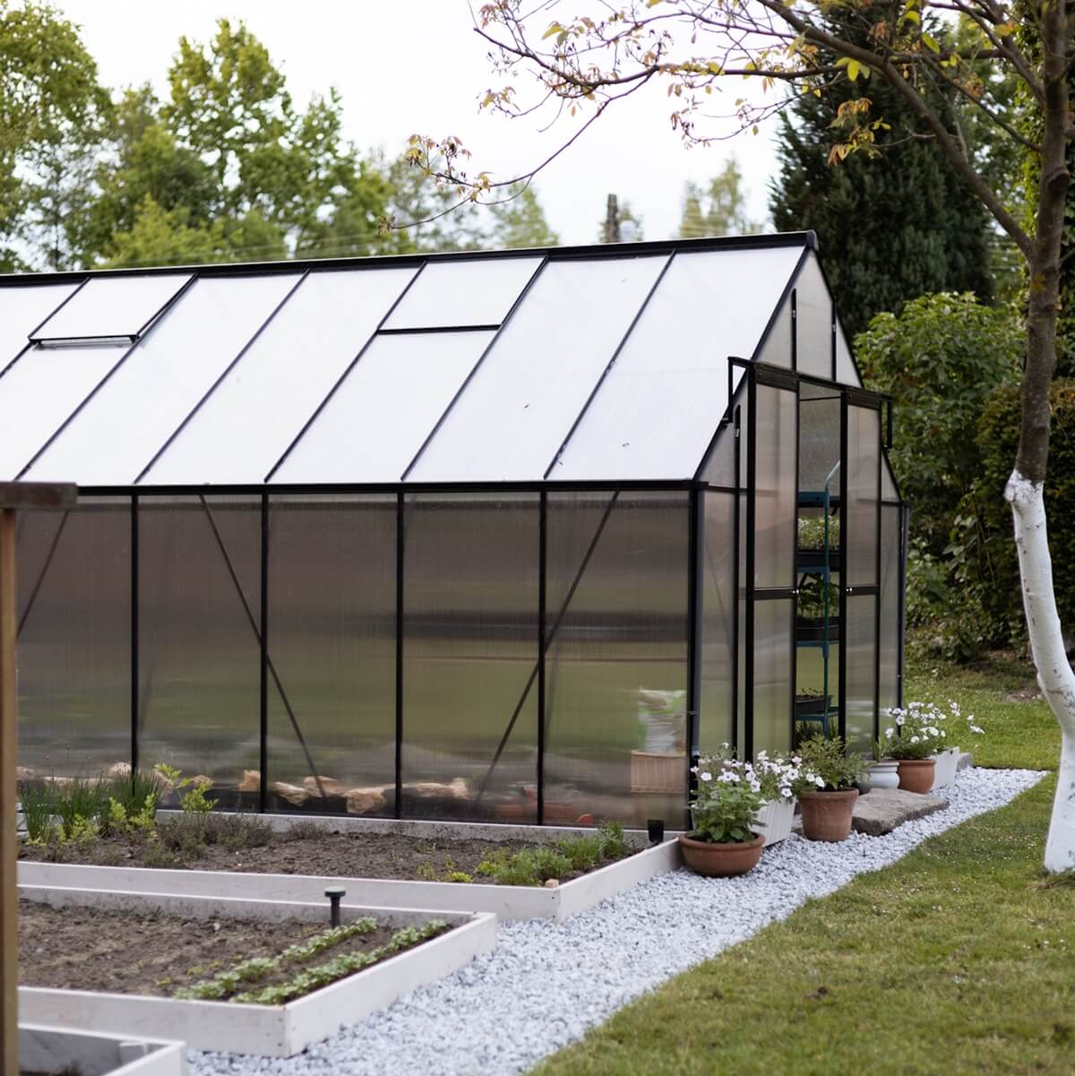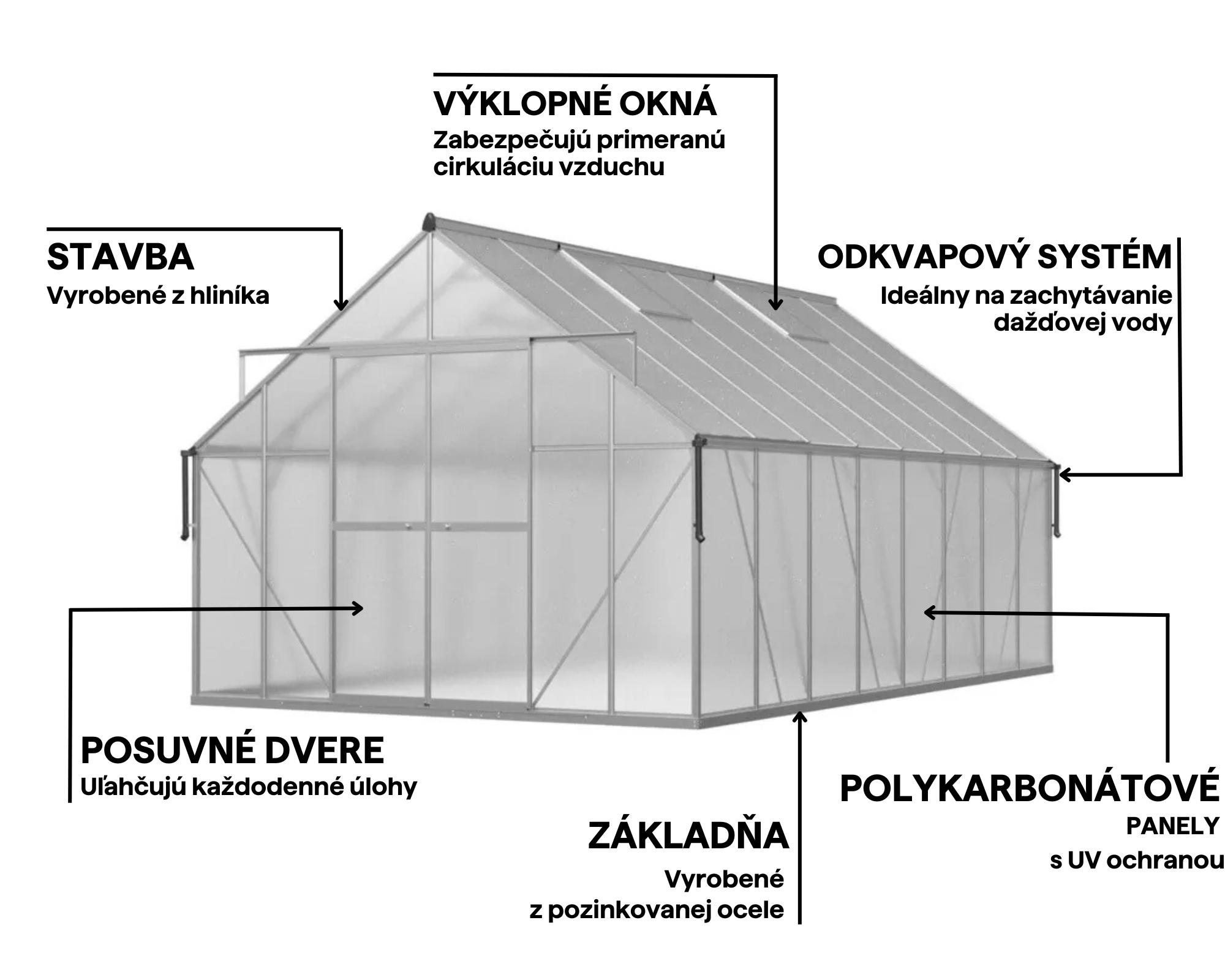 6 mm polykarbonátové panely v kombinácii s ochrannou fóliou udržujú stabilné mikroklíma, zatiaľ čo UV vrstva chráni rastliny pred prehriatím a spálením slnkom.