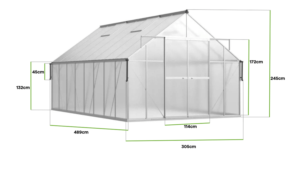 Získajte plnú kontrolu nad svojou záhradou so strieborným skleníkom Cultivo. Tento skleník je vyrobený z vysoko kvalitného hliníkového rámu s hrúbkou 1,3 mm a 6 mm polykarbonátových panelov s UV ochranou, čo zaručuje jeho odolnosť voči meniacim sa poveternostným podmienkam a chráni vaše rastliny pred nadmerným slnečným žiarením a chladom. Vďaka modernému systému „Slide-In“ je inštalácia panelov rýchla, jednoduchá a stabilná a celá konštrukcia získava na pevnosti. Rozmery skleníka 489 cm na dĺžku, 305 cm na šírku a 245 cm na výšku vám poskytujú dostatok priestoru, ideálneho na pestovanie rôznych plodín. Posuvné dvere s rozmermi 172 x 114 cm a štyri vetracie okná umožňujú ľahký prístup a efektívne vetranie, čím zabezpečujú zdravé mikroklíma pre vaše rastliny. K skleníku boli pridané dve horizontálne priečky, ktoré spevňujú konštrukciu strechy a zvyšujú jej odolnosť voči snehu a nárazom vetra. Okrem toho 45 cm dlhá odkvapová rúrka umožňuje zachytávať dažďovú vodu, čo vám dáva možnosť zavlažovať vaše plodiny ekologickým a ekonomickým spôsobom. Záhradný skleník Slide-In NEW 305 x 489 cm Silver - Cultivo z polykarbonátu je konštrukcia, ktorá sa postará o vaše rastliny. Je to vynikajúca investícia pre každého záhradníka, ktorý hľadá spoľahlivý a priestranný skleník na efektívne celoročné pestovanie.