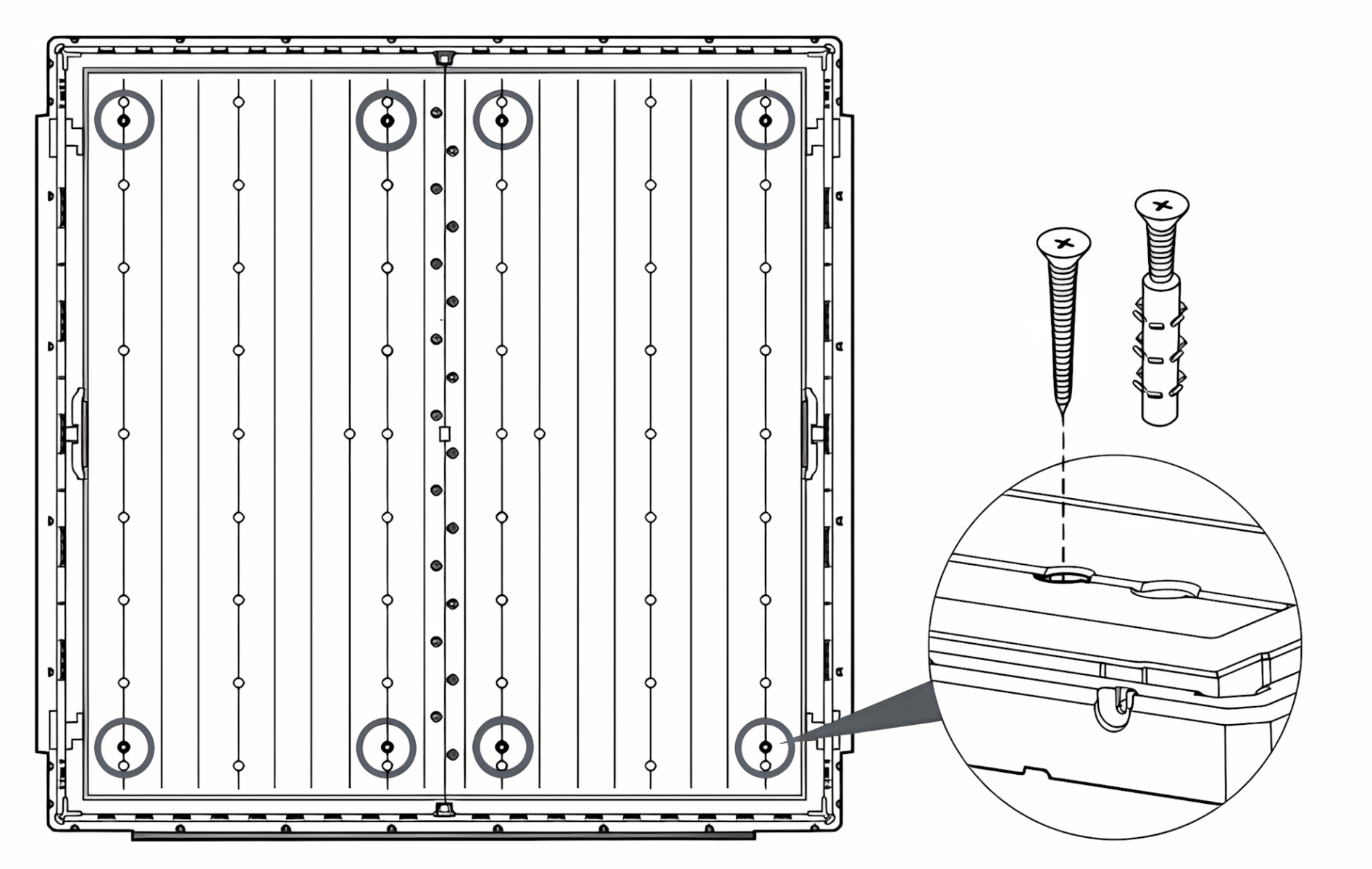 Pre zabezpečenie maximálnej stability odporúčame pripevniť domček k podkladu. V podlahe sa nachádzajú špeciálne montážne body, ktoré umožňujú jednoduché kotvenie pomocou vhodných skrutiek (nie sú súčasťou dodávky).