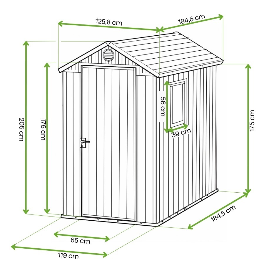 Záhradný domček Darwin 4x6 od spoločnosti Keter v zelenej farbe je praktické a štýlové riešenie na uskladnenie náradia a záhradného vybavenia. Je vyrobený z kompozitných panelov Evotech+ a kombinuje vzhľad prírodného dreva s nulovou potrebou údržby. Montáž na pero a drážku je rýchla a jednoduchá, bez potreby špecializovaného náradia. Vetranie zabezpečuje cirkuláciu vzduchu, zatiaľ čo zosilnená strecha a možnosť uzamknutia visiacim zámkom zvyšujú bezpečnosť. Stabilitu konštrukcie zabezpečuje možnosť ukotvenia do podkladu a na domček sa vzťahuje 10-ročná záruka.