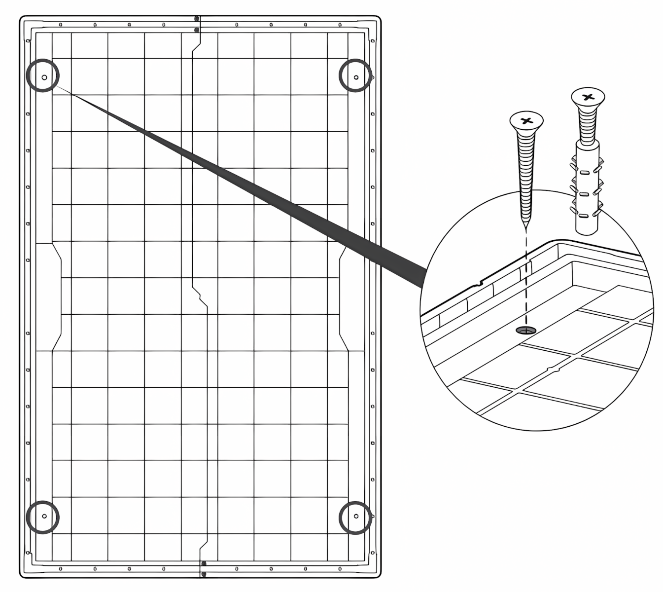Pre maximálnu stabilitu by mal byť domček trvalo pripevnený k podkladu. V podlahe sú špeciálne montážne body umožňujúce rýchle ukotvenie konštrukcie pomocou vhodných skrutiek (nie sú súčasťou balenia).