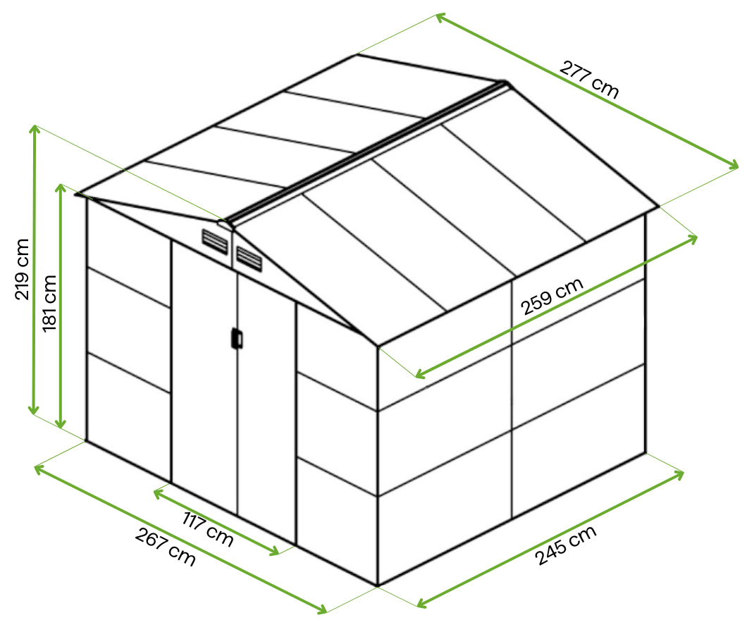 Priestranný domček MONTREAL od spoločnosti Hardmaister s rozmermi 277x259 cm je ideálny pre záhradkárov a domácich majstrov. Domček je vyrobený z pozinkovaných oceľových panelov s hrúbkou 0,25 mm a je odolný voči dažďu, snehu a UV žiareniu. Domček sa ľahko udržiava v čistote vďaka možnosti umývania vodou. Ďalším bonusom je šikmá strecha, ktorá eliminuje riziko zamokrenia.