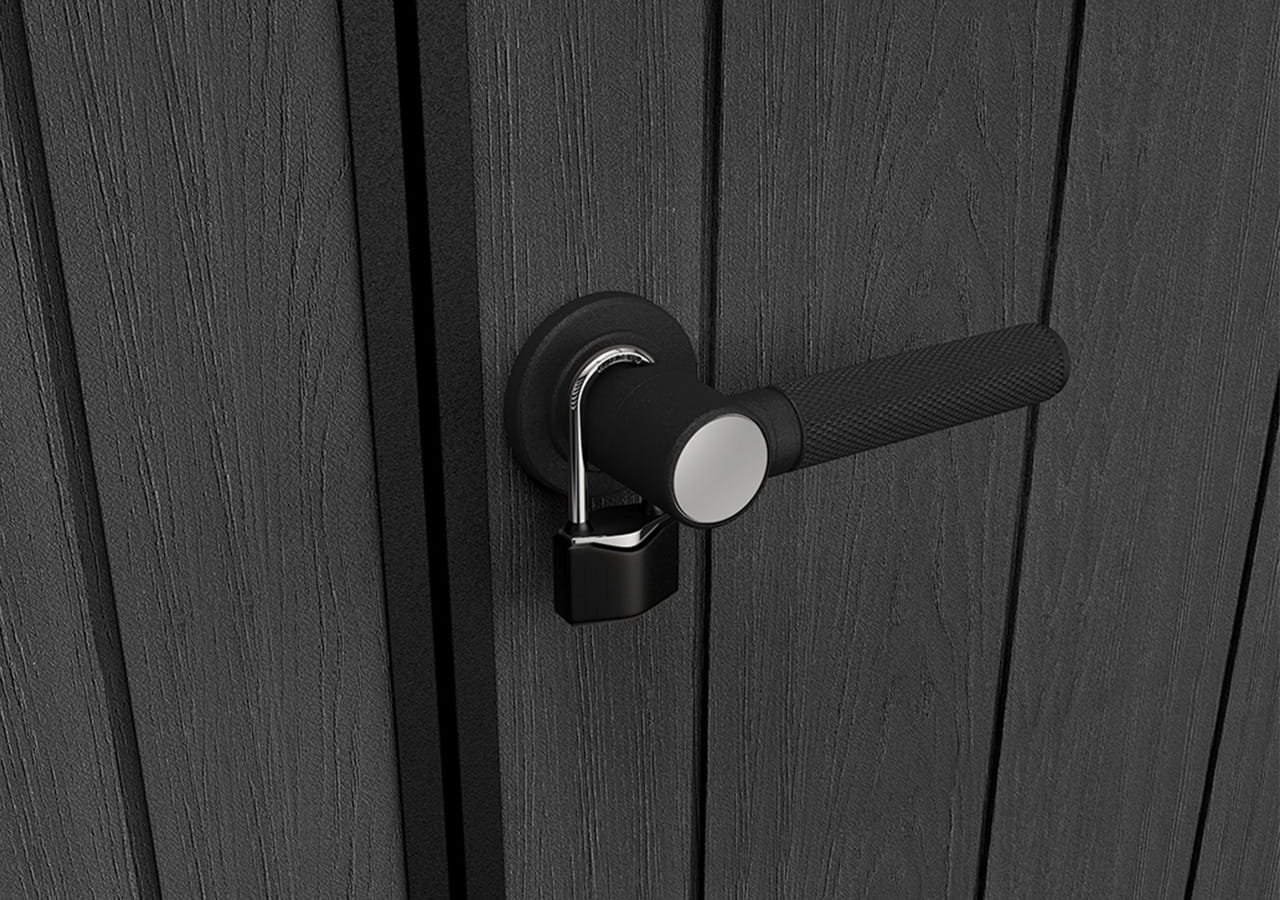 Pevná konštrukcia dverí zaručuje odolnosť, zatiaľ čo oceľový zámok s visiacim zámkom zabezpečuje interiér proti neoprávnenému prístupu.