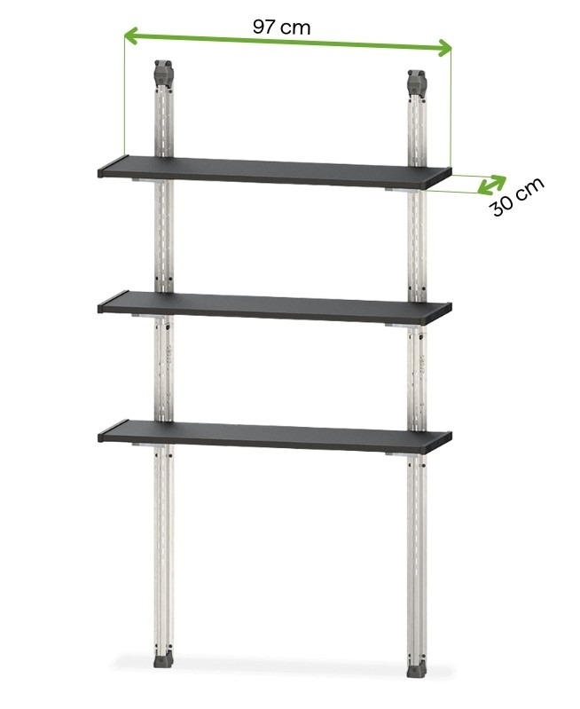 Tri vystužené police s dĺžkou 97 cm, každá s nosnosťou do 30 kg