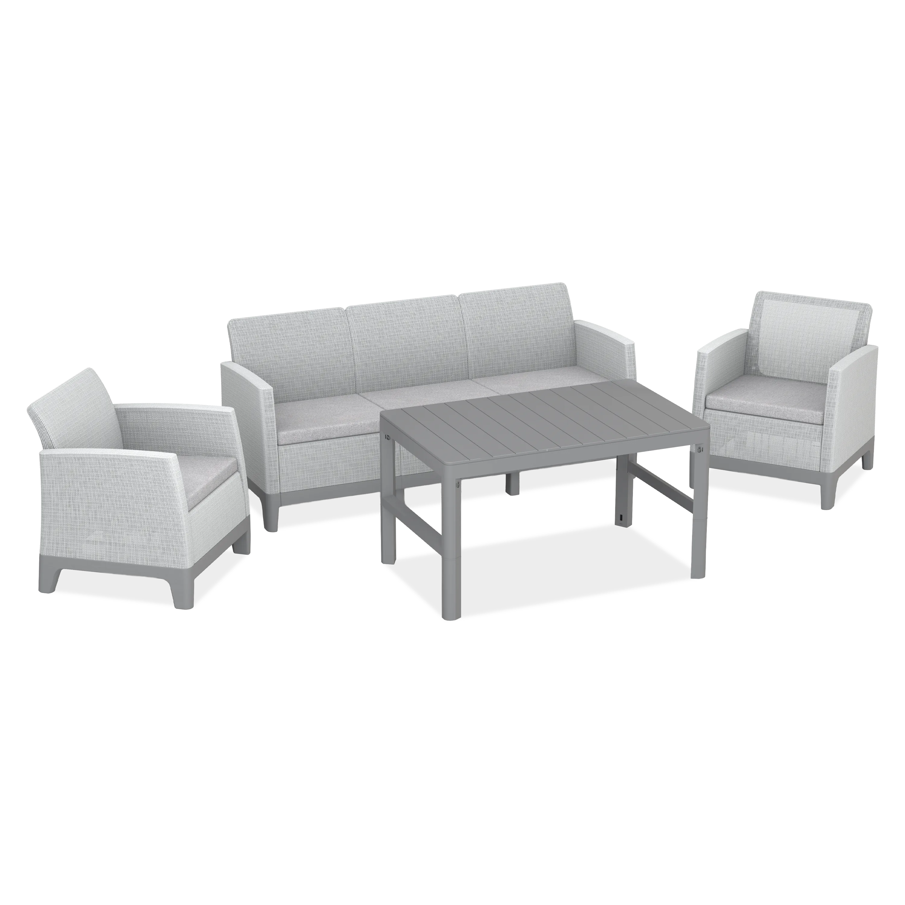 Súprava záhradného nábytku SCANDI MAX3/LYON Pebble Grey-Soft Beige / Sf. Beige od spoločnosti Keter je prestížnym vonkajším riešením, ktoré kombinuje rôzne textúry.Trojmiestna pohovka a kreslá zaujmú výpletom inšpirovaným prírodnou jutou, zatiaľ čo stôl Lyon vyniká elegantnou doskou s textúrou Rezolith. Sofistikovaná farebná schéma Pebble Grey a Soft Beige zjemňuje terasu, zatiaľ čo odolnosť voči UV žiareniu a dažďu zaručuje, že táto luxusná súprava si zachová svoj lesk počas mnohých rušných sezón.