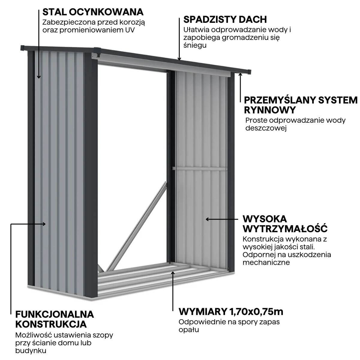 Praktický a estetický prístrešok na drevo Denver je skvelou voľbou pre tých, ktorí hľadajú miesto na uskladnenie palivového dreva a záhradného príslušenstva. Odolná konštrukcia z kovových panelov na oceľovom ráme zaručuje trvanlivosť a odolnosť voči nepriaznivým poveternostným podmienkam. Vďaka odkvapovému systému je voda účinne odvádzaná, čo zabraňuje navlhnutiu uskladnených materiálov. Jemná farba prístrešku na drevo dokonale ladí s prírodným prostredím záhrady.