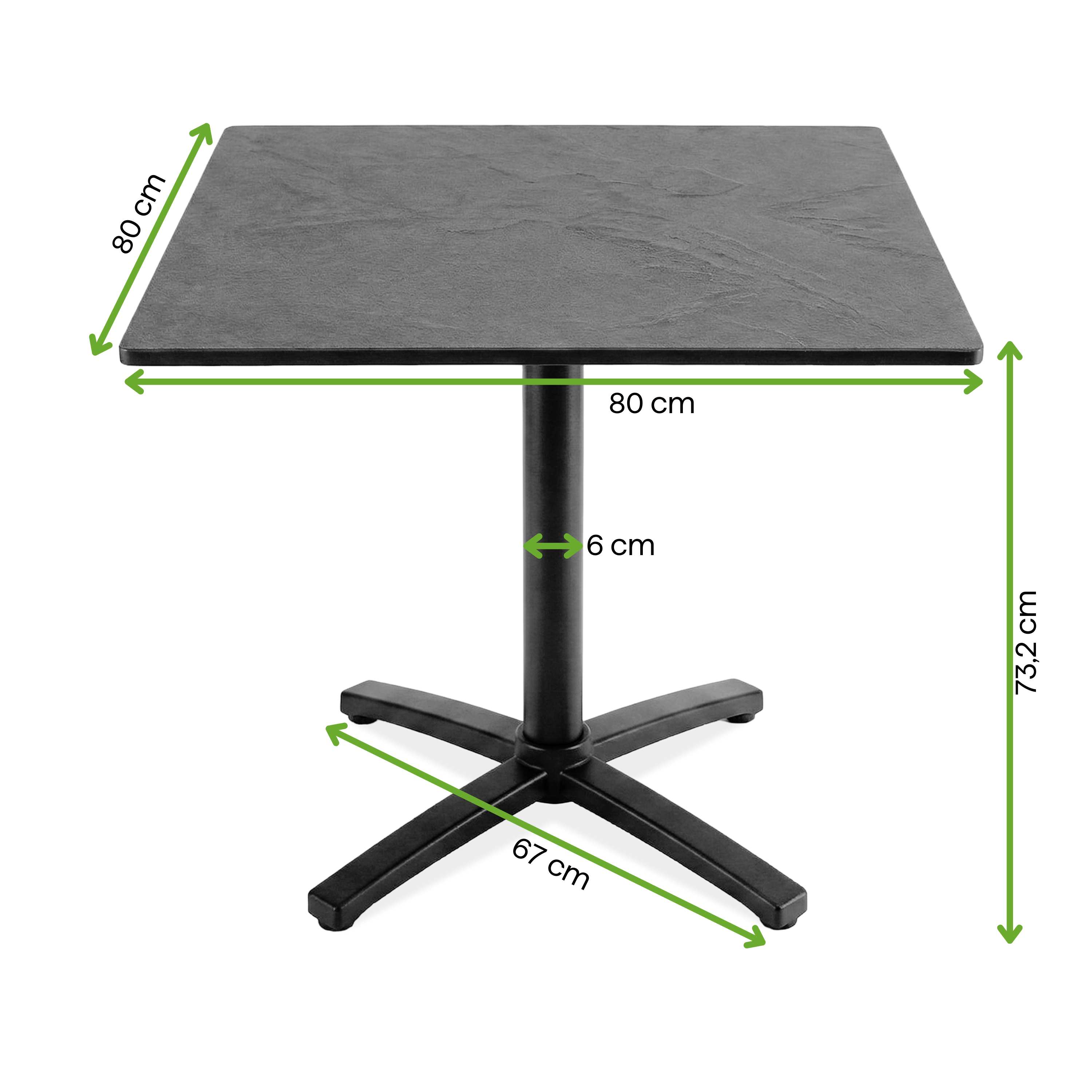 Stôl s hliníkovou podnožou ALVIA/VENA 80 cm - Bjørkka je moderná súprava vytvorená na odolnosť a intenzívne používanie. Vrchná doska VENA 80 ANTHRACITE MARBLE z HPL laminátu sa vyznačuje vysokou odolnosťou proti poškriabaniu, oderu, nárazom a UV žiareniu, takže si dlhodobo zachováva estetický vzhľad. Neporézny, hygienický povrch neabsorbuje vlhkosť a ľahko sa udržiava, vďaka čomu je stôl ideálny do reštaurácií, kaviarní, kancelárií a verejných priestorov. Stabilná podnož ALVIA Black z hliníka lakovaného pieskovo čiernou farbou spája ľahkosť s pevnosťou. 72 cm vysoká konštrukcia s krížovým sklápacím upevnením poskytuje pevnú oporu vrchnej doske s rozmermi 80 × 80 cm a pohodlné používanie a skladovanie.