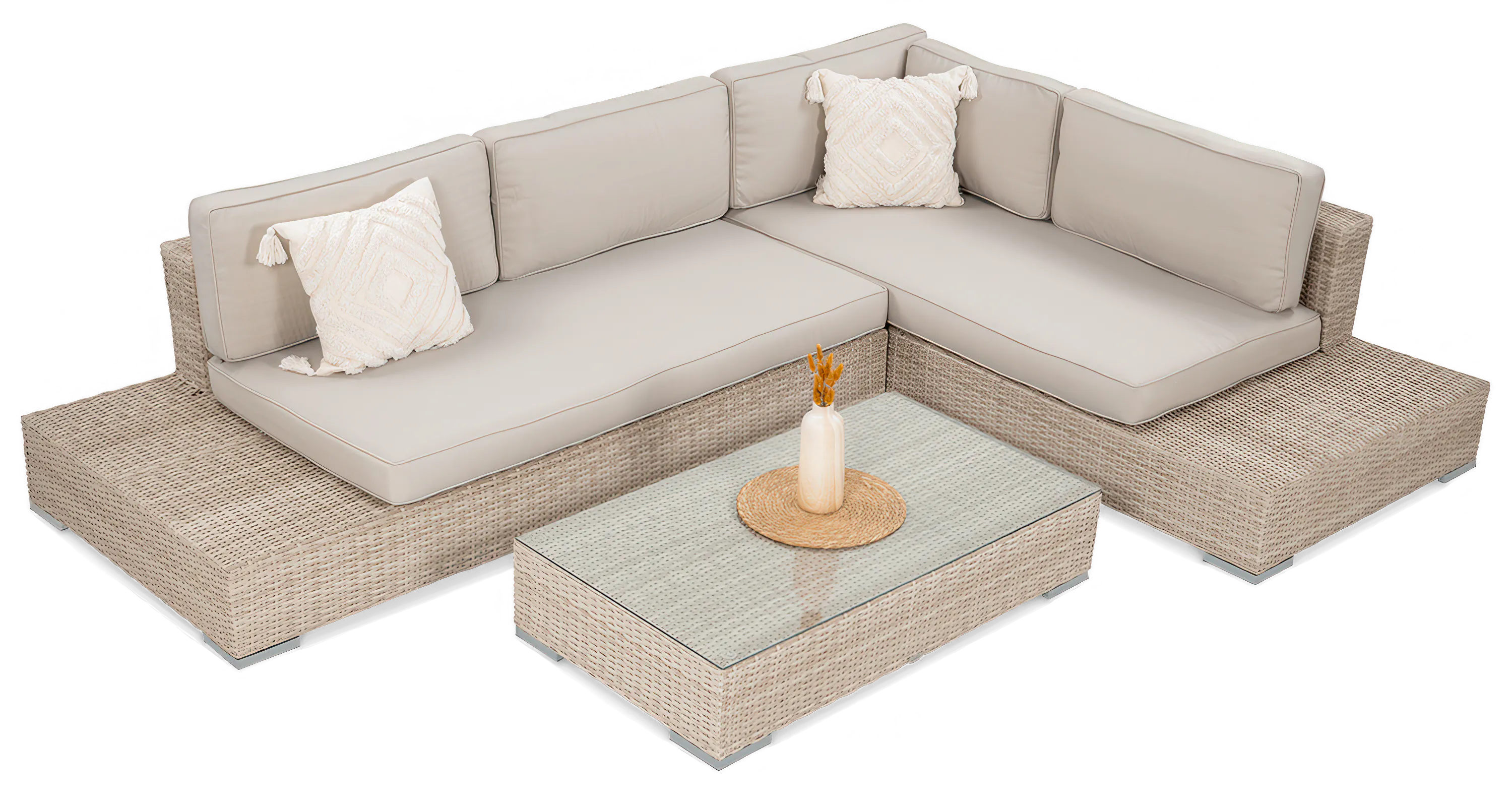 Rohová pohovka VERONA Beige techorattan sa odporúča ľuďom, ktorí oceňujú pohodlie a sofistikovaný a jedinečný vzhľad. Súprava sa skladá z dvoch modulov a stolíka, ktoré vám umožnia vychutnať si popoludňajšiu kávu s priateľmi alebo rodinou v príjemnom prostredí. Použité materiály zaručujú trvanlivosť a odolnosť voči poveternostným podmienkam, zatiaľ čo elegantné a vkusné vyhotovenie detailov podčiarkuje jej vysokú kvalitu.Charakteristickénadstavce modulov opticky zväčšujú súpravu a dodávajú jej jedinečný šarm. Voliteľne môžu slúžiť ako poličky na ľahké, drobné príručné predmety Milovníkom dizajnu vrelo odporúčame.