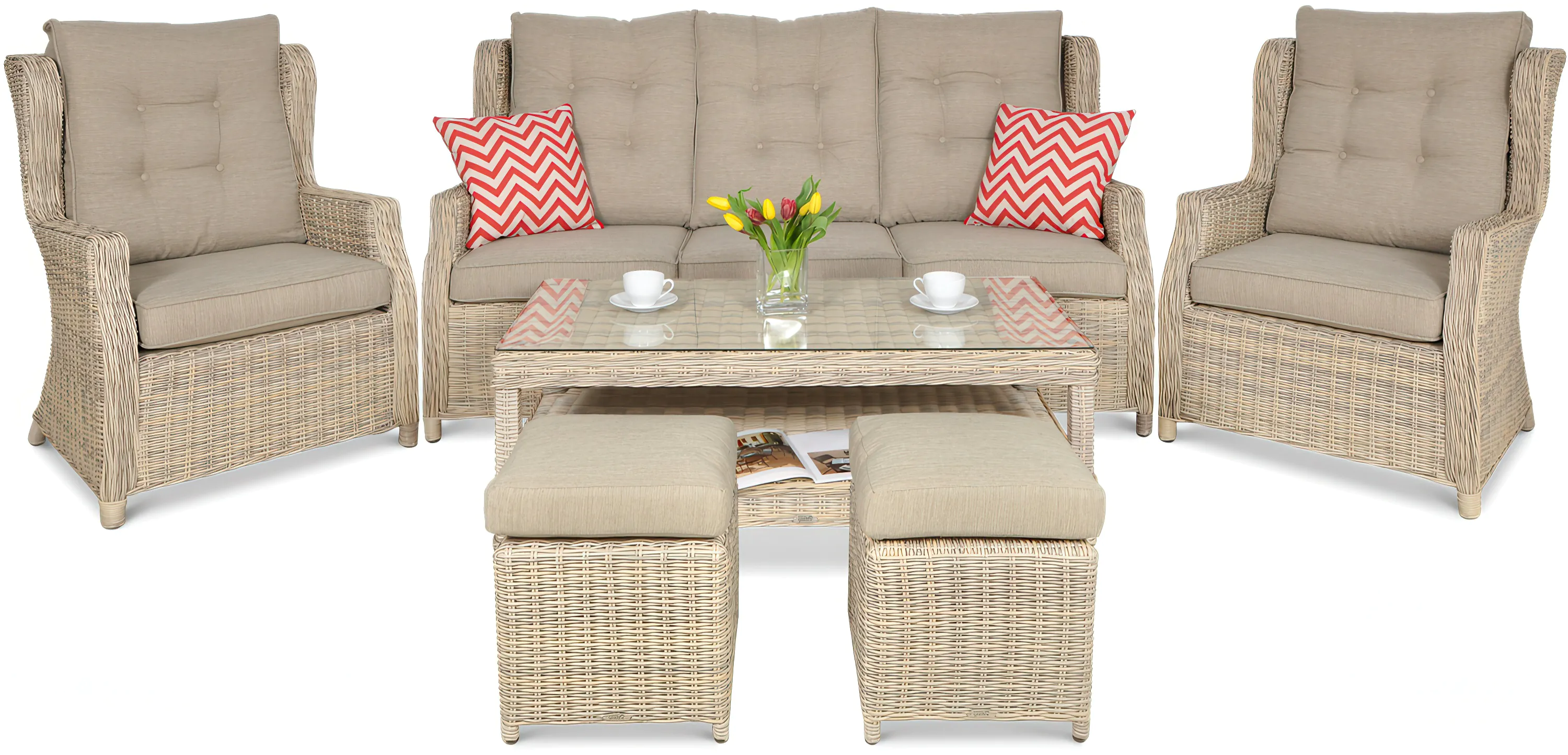 Moderná a elegantná obývacia súprava vyrobená z kvalitného technorattanu. Súprava sa skladá z veľkých a pohodlných kresiel, trojmiestnej pohovky, dvoch pufov a konferenčného stolíka. Maximálne pohodlie pri relaxácii zabezpečujú hrubé vankúše odolné voči deformácii. Pútavý dizajn a jedinečná farba budú ozdobou vašej záhrady alebo bytu. Vysoká trvanlivosť a odolnosť voči poveternostným podmienkam zabezpečí, že naša súprava vydrží dlhé roky.