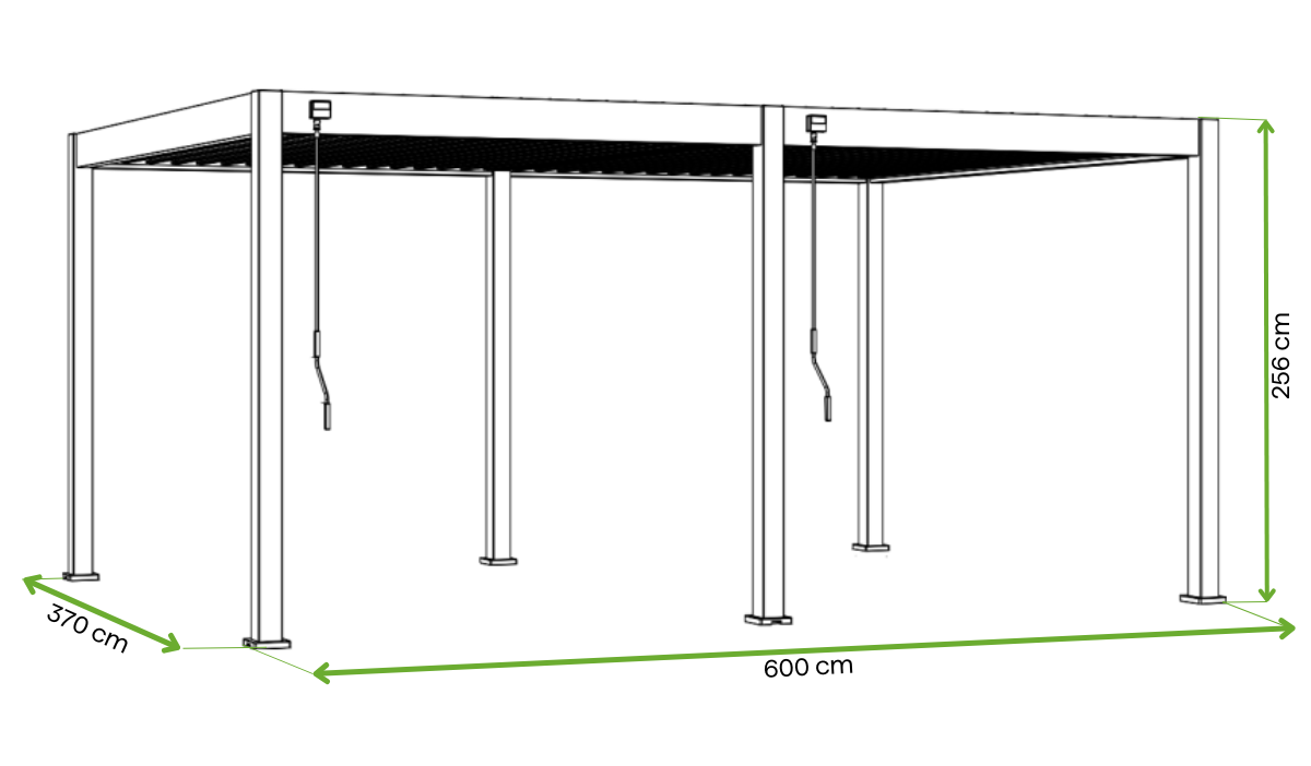 Rozmery pergoly: 370 × 600 × 256 cm