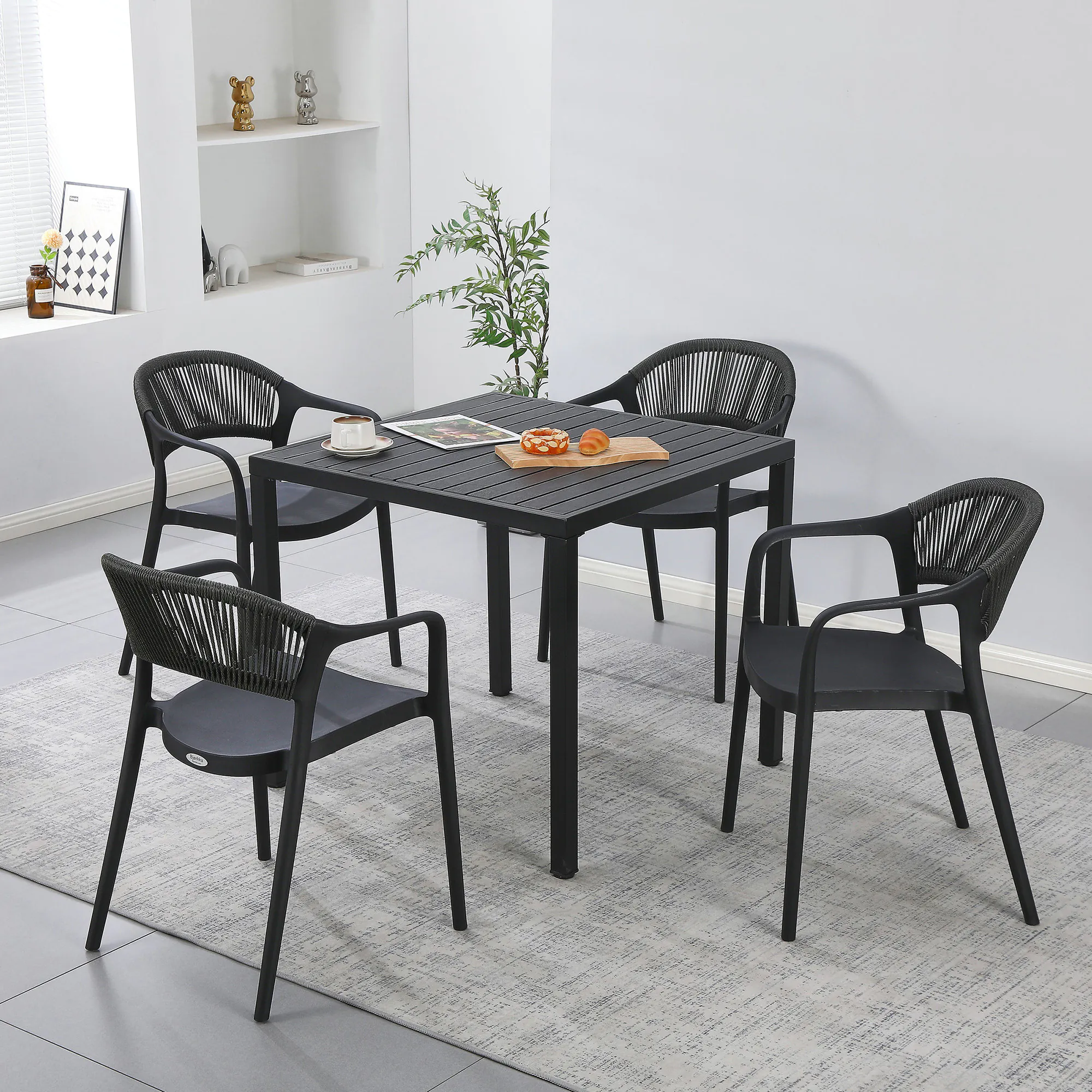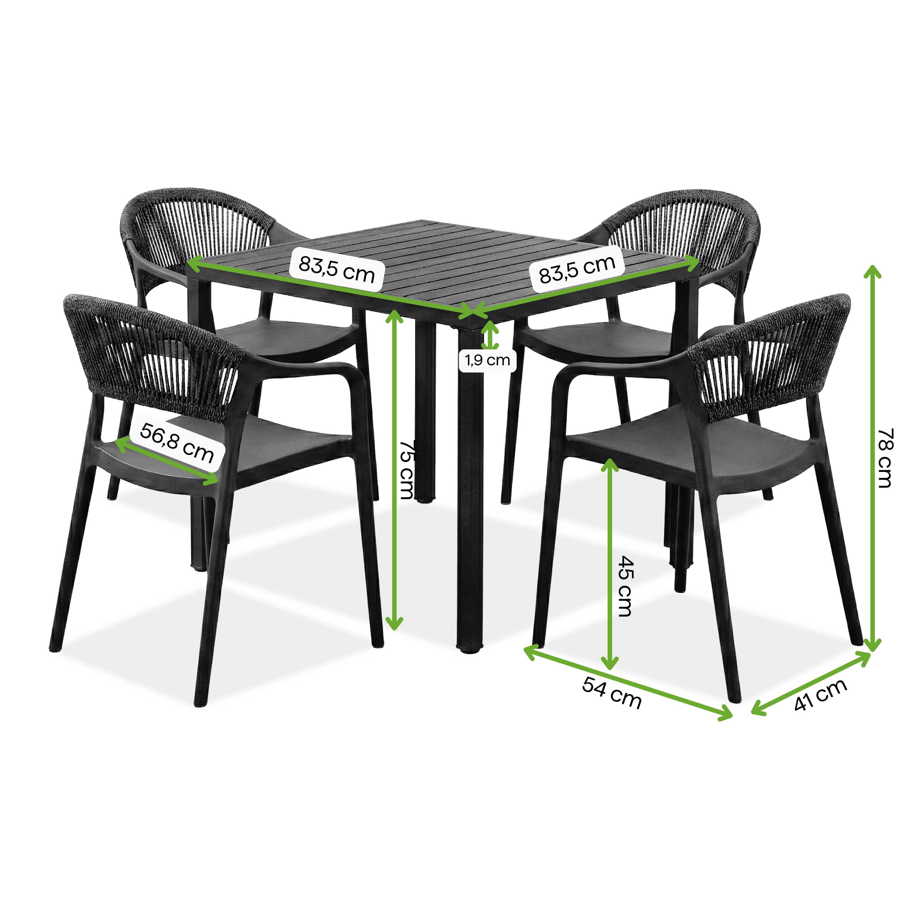 Terasová súprava TESSA/BRIS Black - Bjørkka je funkčnou kombináciou ľahkej formy a odolných materiálov, určenou na vonkajšie použitie. Stolička TESSA spĺňa európske normy bezpečnosti a odolnosti, má plastovú konštrukciu s UV filtrom a operadlo z odolnej tkaniny. Jej maximálna nosnosť je 150 kg. Model je stohovateľný, čo uľahčuje skladovanie, a ergonomická výška sedadla 45 cm poskytuje pohodlie pri každodennom používaní. Stôl BRIS má pevnú dosku a kovové nohy chránené antikoróznym náterom na vonkajšie použitie; celá súprava je stabilná, ľahko sa montuje a je vhodná na použitie na terase. Všetky prvky súpravy majú protišmykové podložky a nastaviteľné nožičky stola umožňujú vyrovnať nábytok aj na nerovnom povrchu.
