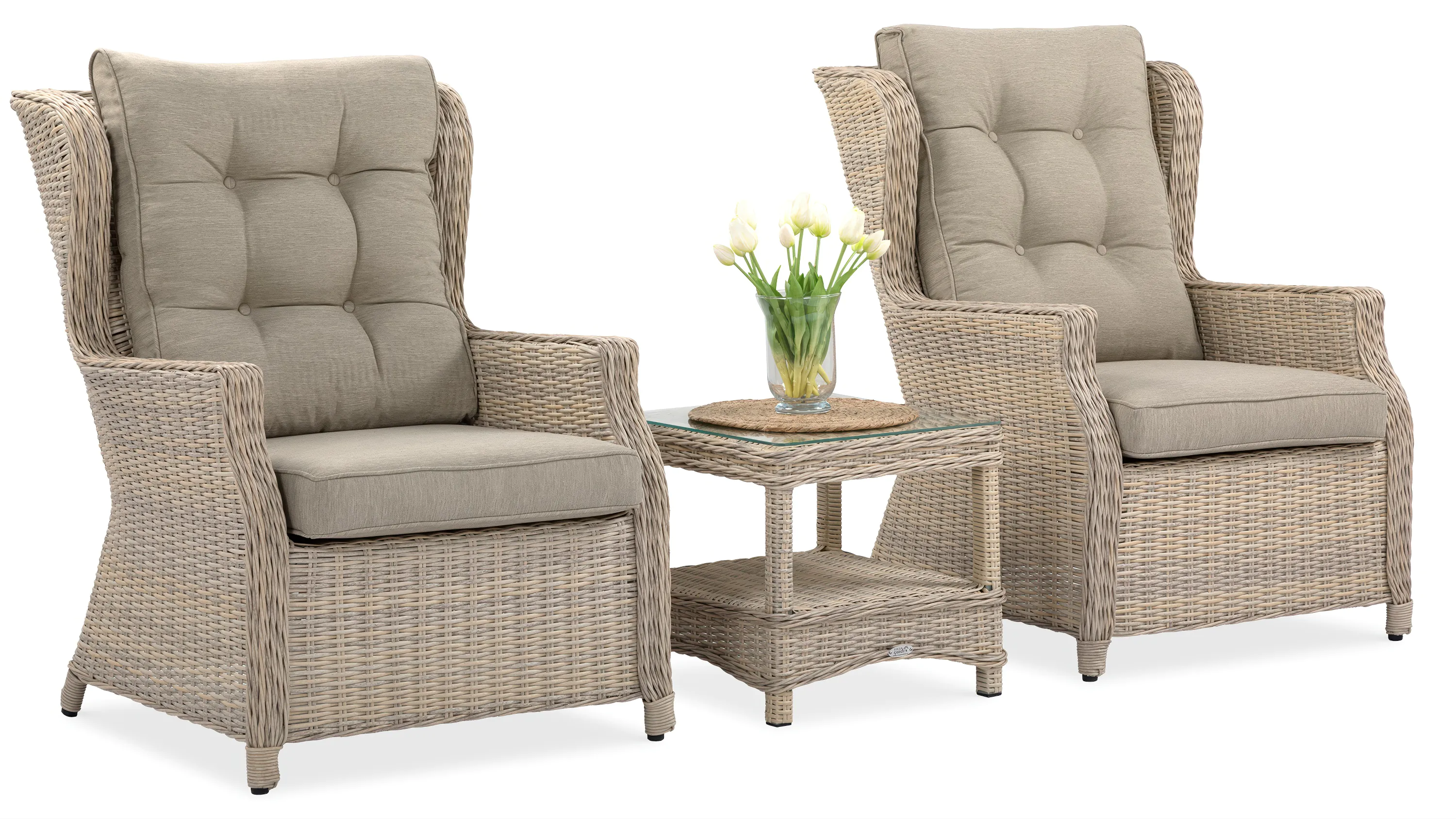 Hľadáte ideálnu záhradnú zostavu nábytku pre dvoch? Táto súprava si určite zaslúži pozornosť! Trivento Duo Beige je komplet pozostávajúci z dvoch veľmi pohodlných kresiel a malého stolíka. Skvele poslúži pri rannej káve, popoludňajšom čaji alebo dlhých večerných rozhovoroch. Mäkké a priestranné kreslá v klasickom štýle poskytujú výnimočný komfort a zároveň pridávajú eleganciu oddychovému kútiku vo vašej záhrade, na terase alebo balkóne. Nábytok pôsobí veľmi vkusne a láka stráviť aspoň niekoľko chvíľ na čerstvom vzduchu. Záhradný nábytok Trivento Duo Beige je vyrobený z praktického a estetického technorattanu. Ide o materiál, ktorý skvele napodobňuje prírodný ratan a zároveň sa vyznačuje vysokou odolnosťou a trvácnosťou voči poveternostným podmienkam. Preto je nábytok Trivento vhodný na vnútorné aj vonkajšie použitie. Nezničí ho voda, vlhkosť, vysoké ani nízke teploty, ani nevybledne pôsobením slnečného žiarenia. Je navrhnutý tak, aby potešil oko a plnil svoju funkciu mnoho rokov. Pohodlné kreslá Trivento majú tradičný tvar, ktorý sa skvele prispôsobí starostlivo navrhnutému a dobre udržiavanému priestoru. Sedadlo a operadlo sú pokryté mäkkými, hrubými vankúšmi, ktoré poskytujú výnimočné pohodlie. Malý stolík má dosku z hrubého tvrdeného skla. Celý set je veľmi ľahko čistiteľný – technorattan stačí utrieť vlhkou handričkou a poťah vankúšov je možné zložiť a vyprať v práčke. Pevnosť nábytku zabezpečuje ľahký a odolný hliníkový rám. Vďaka tomu sú nielen krásne, ale aj praktické.
