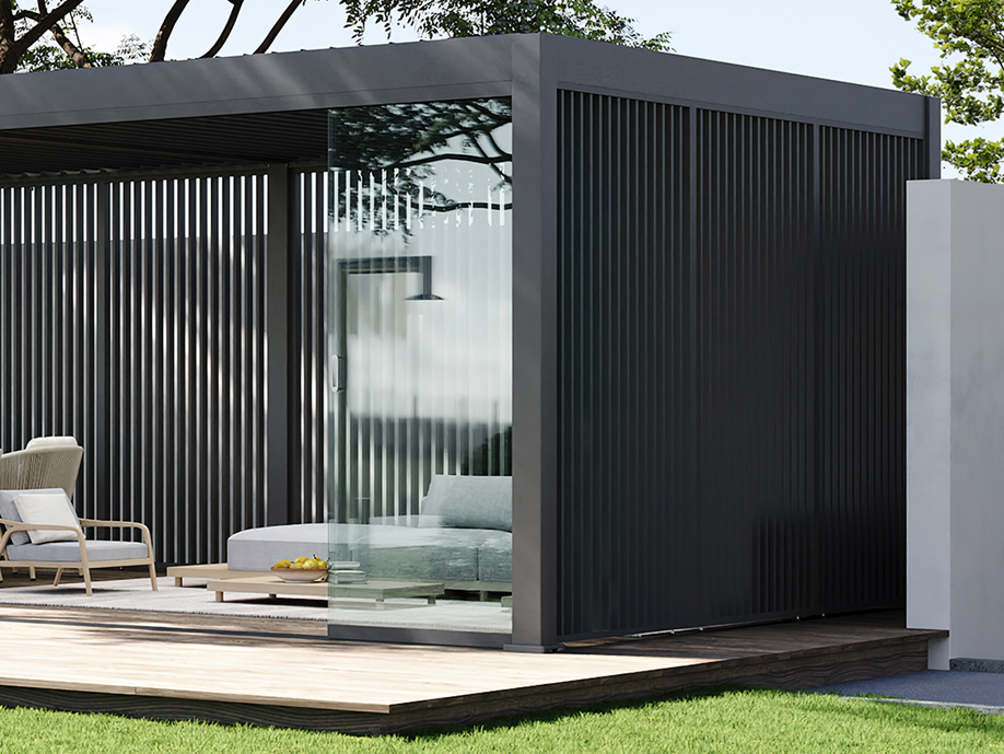 Úplné zakrytie – umiestnením panelov pozdĺž celej strany pergoly vytvoríte odľahlý priestor ideálny na relaxáciu, ktorý vás ochráni pred slnkom a vetrom