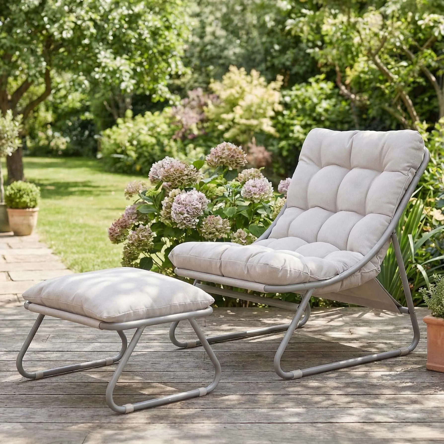 Priložený puf umožňuje pohodlne si oprieť nohy a zvyšuje komfort oddychu. Môže slúžiť aj ako ďalšie sedadlo.