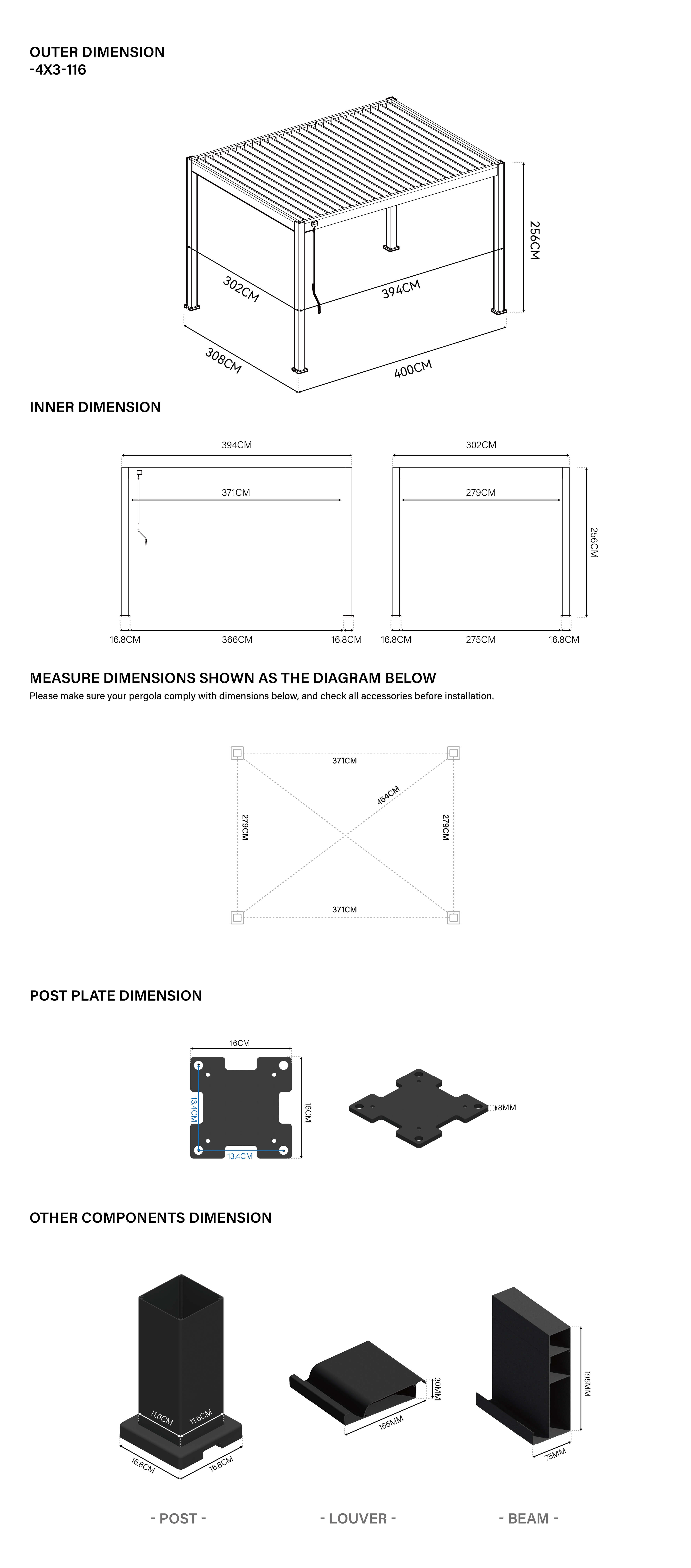 Montáž pergoly je jednoduchá a nevyžaduje si špecializované zručnosti, avšak vzhľadom na veľkosť konštrukcie odporúčame montáž s pomocou 2-3 osôb. Všetky potrebné montážne komponenty sú súčasťou balenia, čím sa proces montáže zjednodušuje a zrýchľuje.