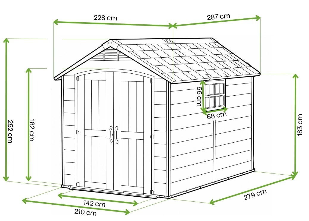Záhradný domčekPremier 759 je vydarenou kombináciou klasického dizajnu a modernej funkčnosti. Je vyrobený z odolného polypropylénu s hrúbkou 16 mm, nevyžaduje náter ani impregnáciu a vďaka odolnosti voči UV žiareniu si zachováva estetický vzhľad po celé roky. Kovové vystuženie konštrukcie a ventilačný systém zaručujú odolnosť a komfort pri používaní. Zabudované okno a strešné svetlíky prepúšťajú prirodzené svetlo a tesná podlaha účinne izoluje interiér od vlhkosti. Na výrobok sa vzťahuje 10-ročná záruka výrobcu.