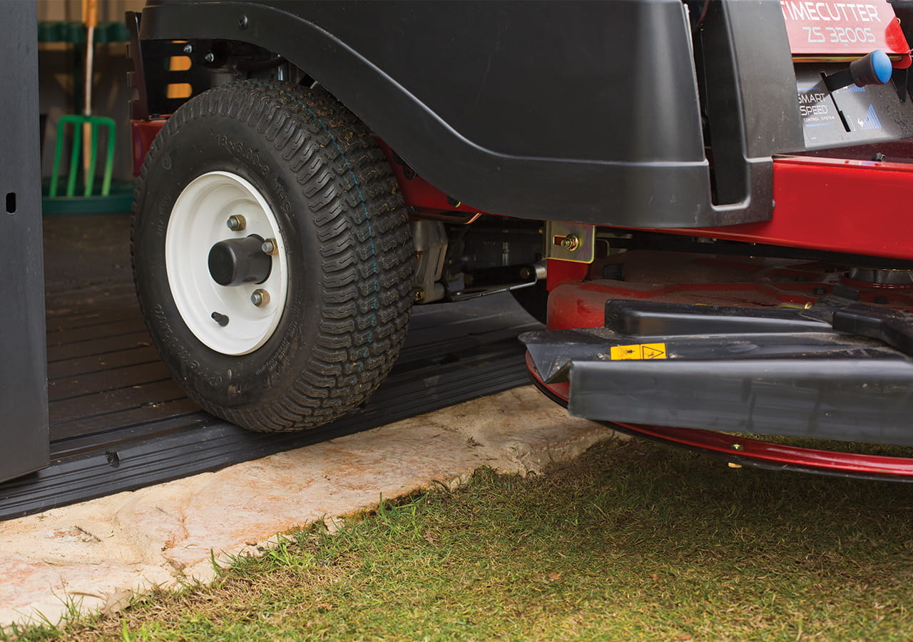 Nízky prah výrazne uľahčuje vnášanie kosačiek, fúrikov a väčšieho náradia. Absencia prekážok pri vchode zvyšuje komfort každodenného používania domčeka.